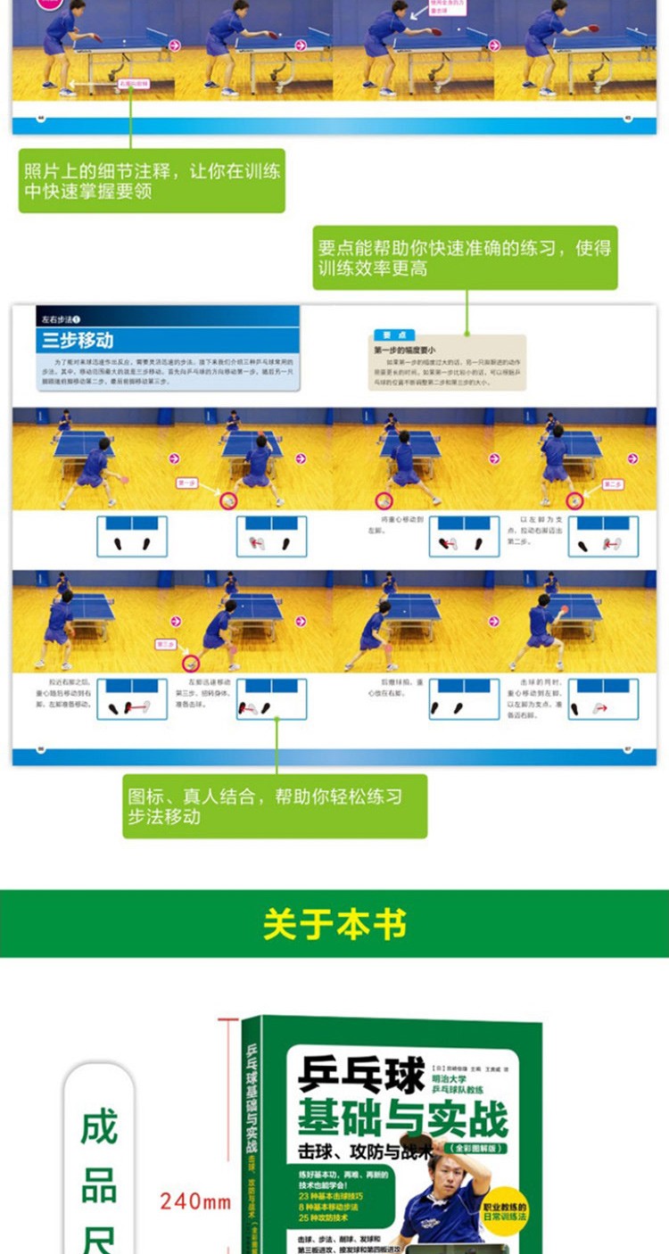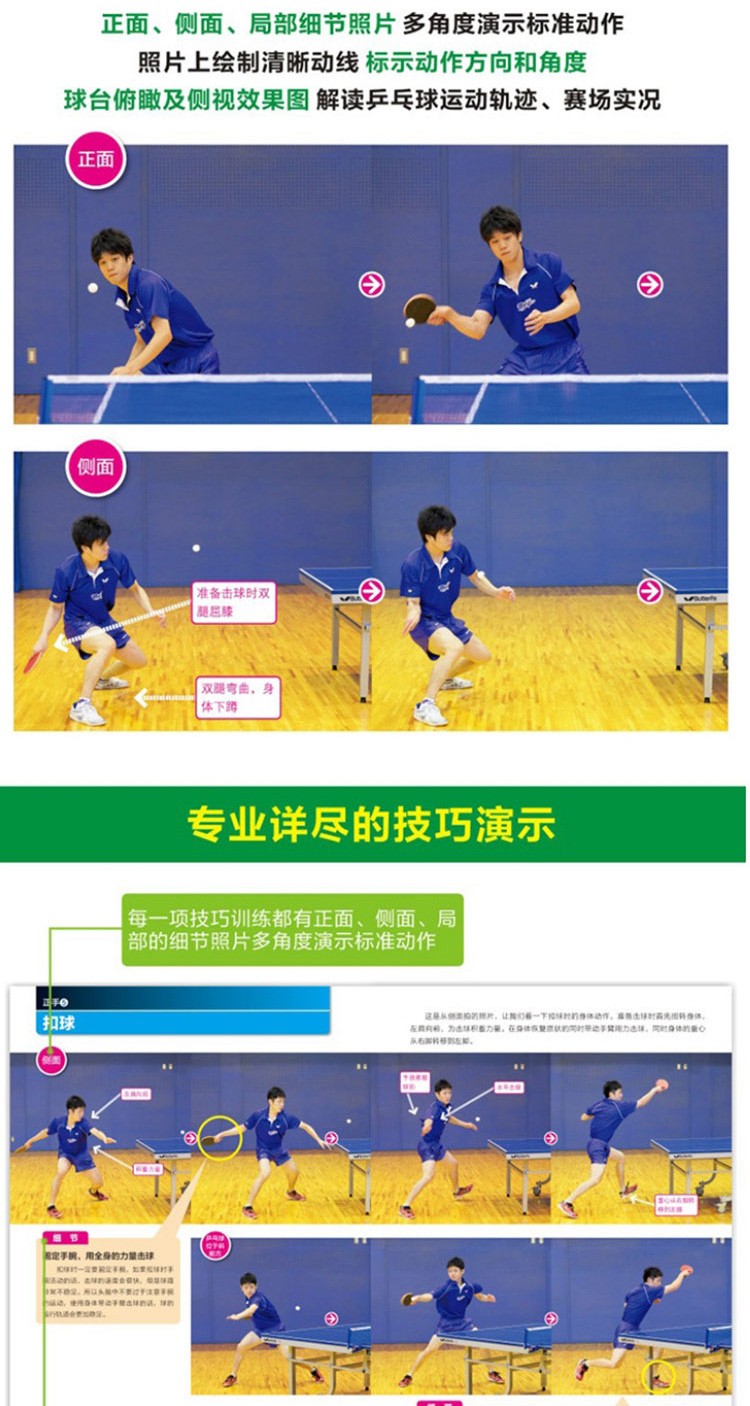 《乒乓球基礎與實戰:擊球、攻防與戰術(全彩圖解版)》通過正面、側面、局部細節放大展示和動作連拍等多種照片展示方法,超細緻解析每一個基礎動作。 桌球的運動軌跡、球員動作的方向和角度也都在照片上標示出來,非常易於理解和模仿。