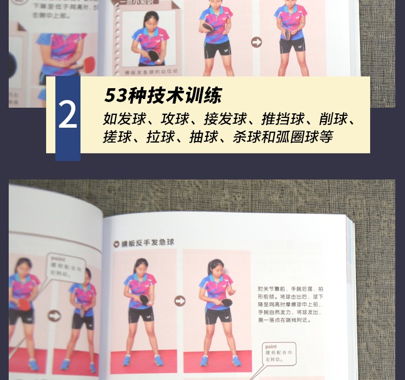 ·53種科技訓練:發球、攻球、接發球、推擋球、削球、搓球、拉球、抽球、殺球、弧圈球