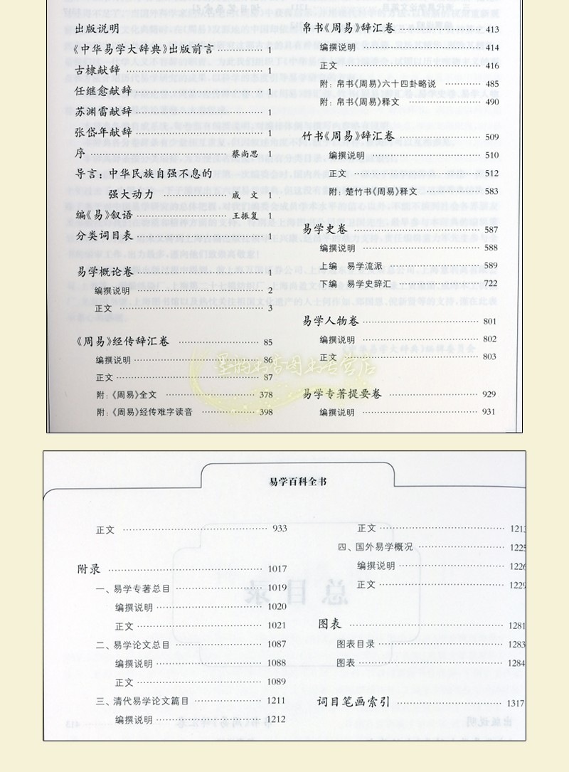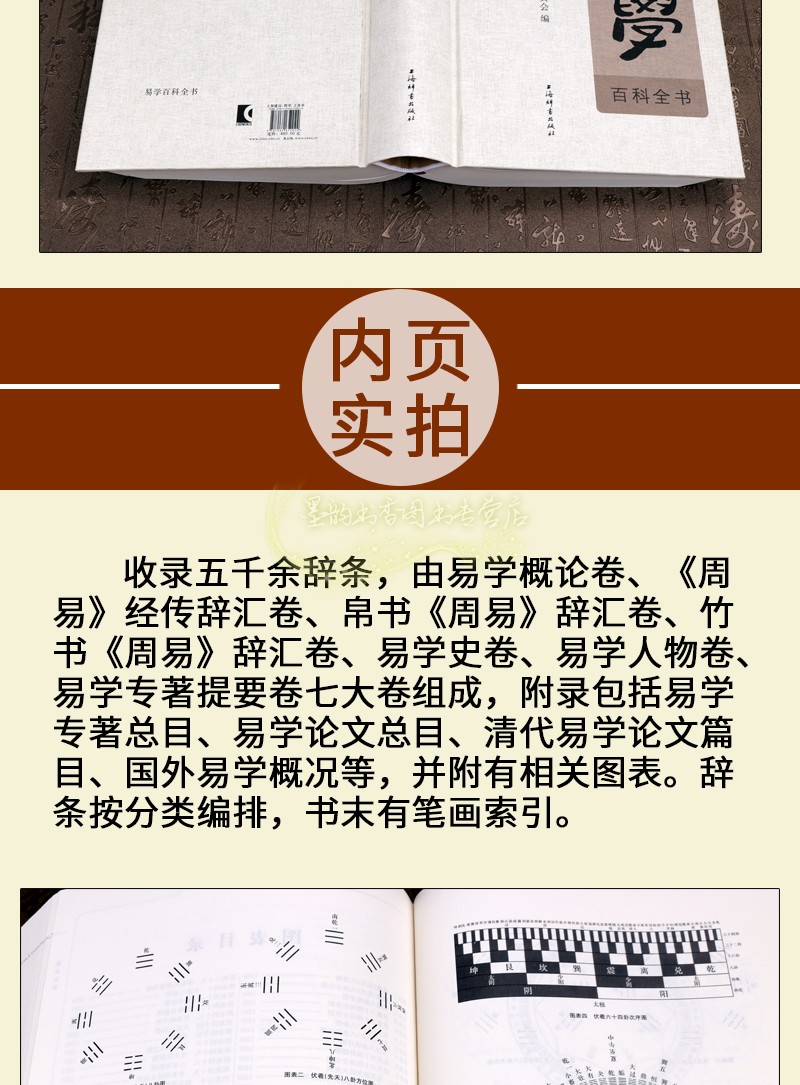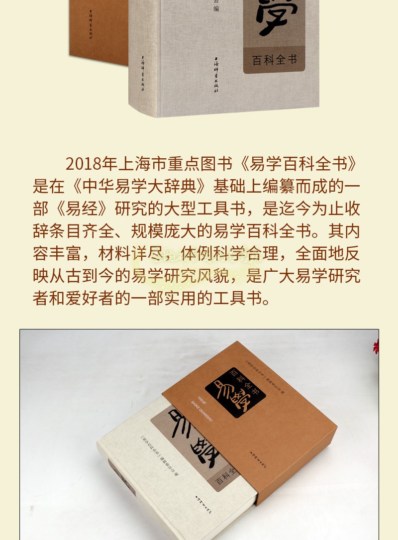2018年上海市重點圖書《易學百科全書》是在《中華易學大辭典》基礎上編纂而成的一部《易經》研究的大型工具書,是迄今為止收辭條目*為齊全、規模*為龐大的易學百科全書。 其內容豐富,資料詳盡,體例科學合理,全面地反映從古到今的易學研究風貌,是廣大易學研究者和愛好者的一部實用的工具書。 收錄五千餘辭條,由易學概論卷、《周易》經傳辭匯卷、帛書《周易》辭匯卷、竹書《周易》辭匯卷、易學史卷、易學人物卷、易學專著提要卷七大卷組成,附錄包括易學專著總目、易學論文總目、清代易學論文篇目、國外易學概況等,並附有相關圖表。 辭條按分類編排,書末有筆劃索引。 書稿內容,兼具學術性、普及性,對易學研究愛好者有一定的參攷價值。