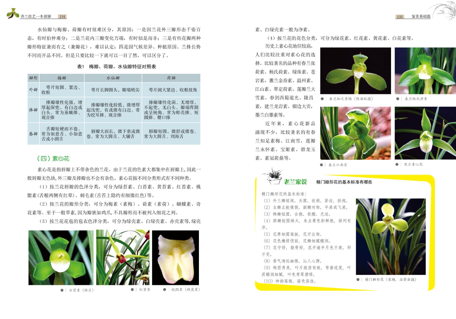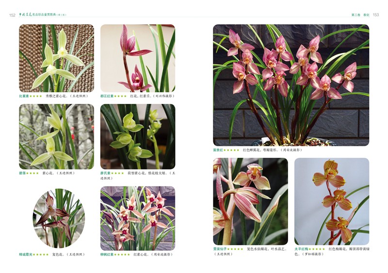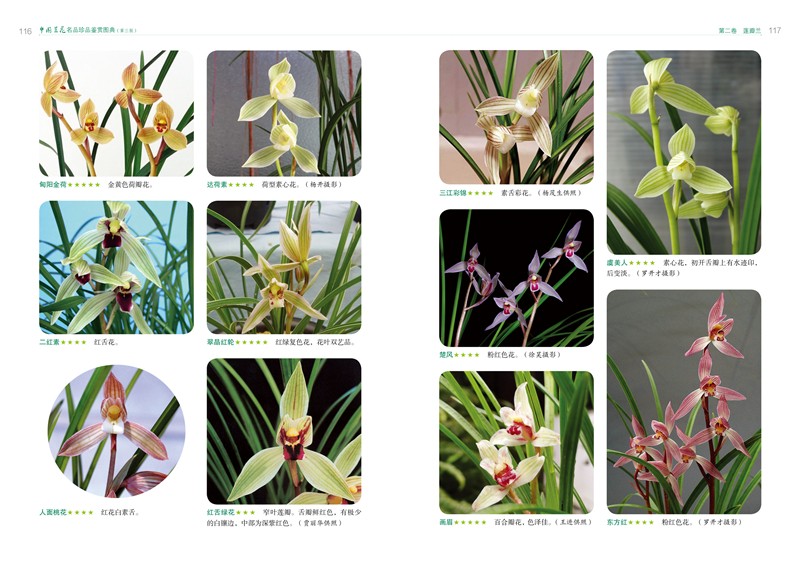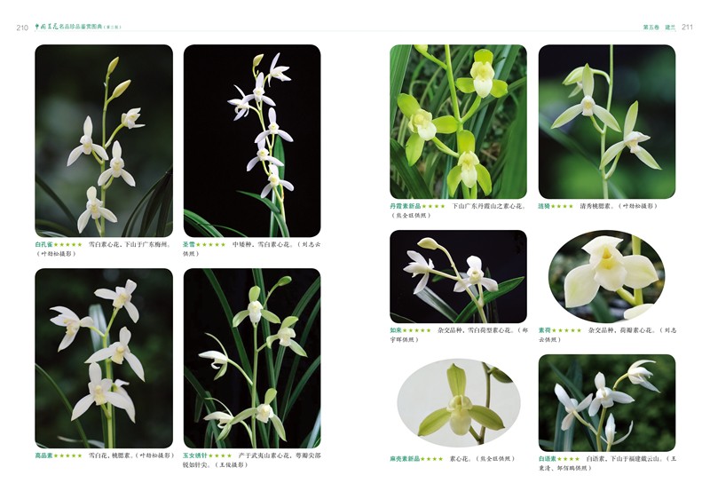亮點二新:此次修訂注重收錄近年湧現的新品種,如春蘭長樂荷、大中華、雪裏桃花等,蓮瓣蘭虞美人、東方紅、珍荷等,春劍富貴紅、凝脂、媚荷等,蕙蘭空谷足音、鳳羽、陽城素等,建蘭聖雪、玉白丹紅、天龍紫荷等,寒蘭金玉滿堂、皇妃、緣素等。 本次修訂收錄新品及傳統經典傳統名品400餘種。