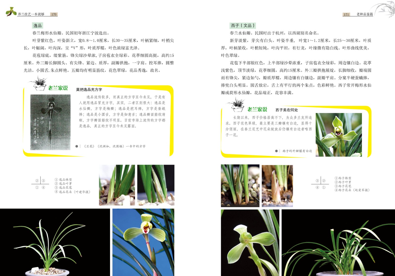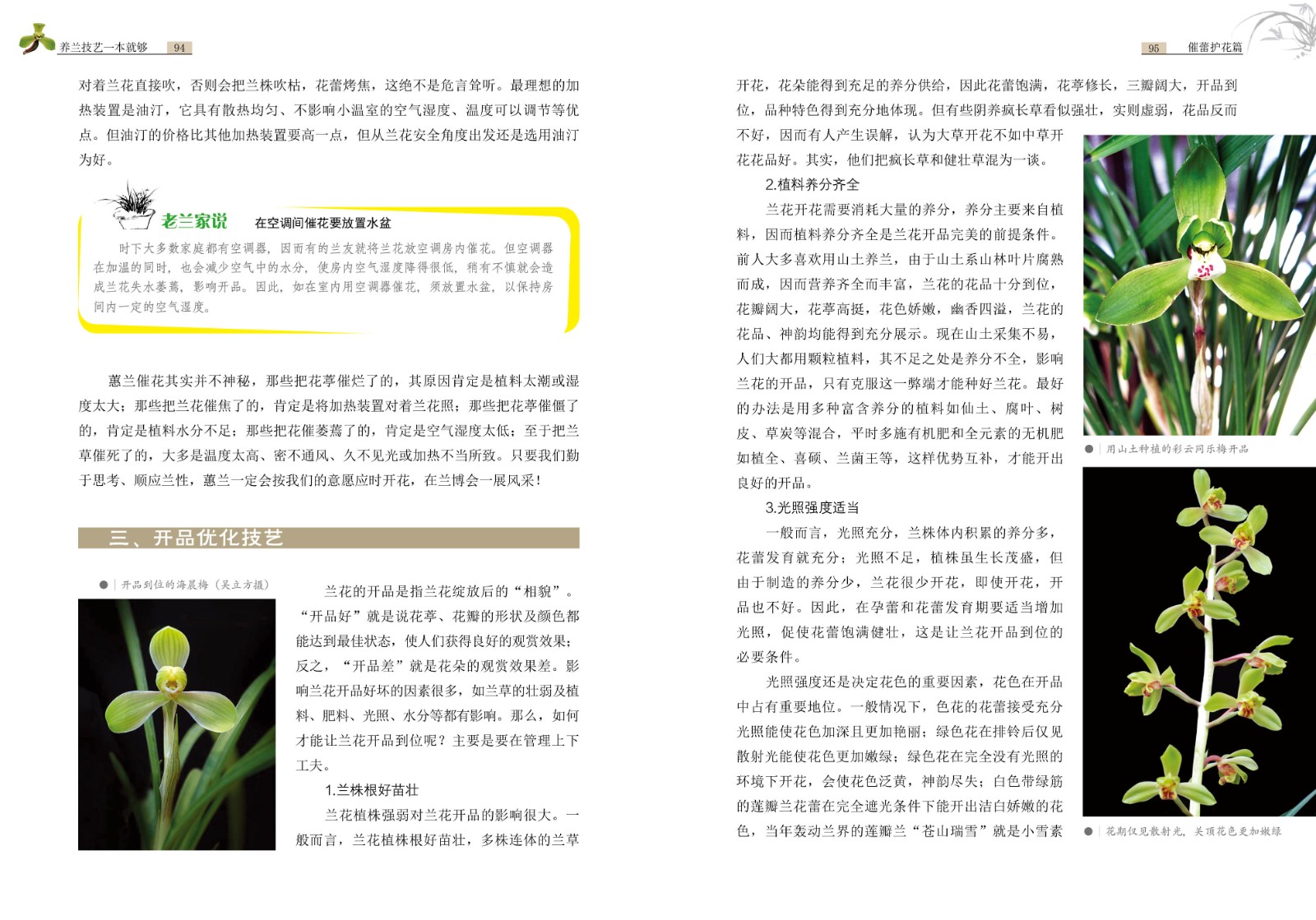 亮點二實用性強:重點介紹養蘭中的關鍵技藝,如弱苗小苗的復壯技藝、促二次發芽技藝、光蘆頭催芽技藝、催花技藝、促花好香足技藝、杜絕空根技藝、防止葉片焦尖技藝等。