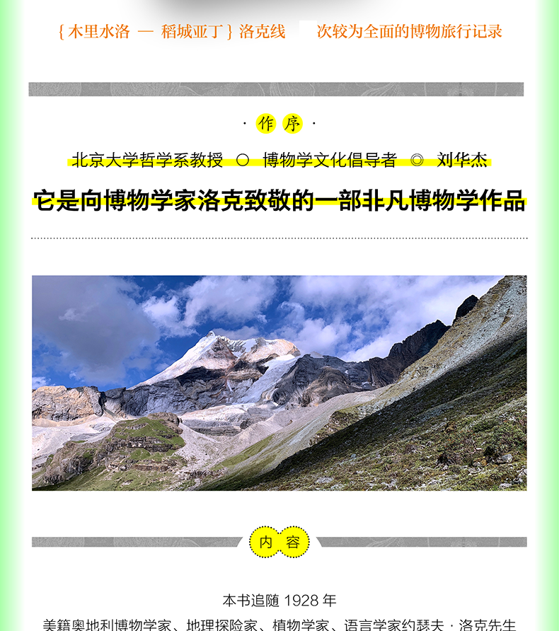本書追隨1928年美籍奧地利博物學家、地理探險家、植物學家、語言學家約瑟夫·洛克先生考察穿越貢嘎嶺路線的足迹,用兩個時間段,再現了沿途藏地高原春夏植物、地質地貌、風土人情。 這是“洛克線”首次較為全面的博物考察記錄。
