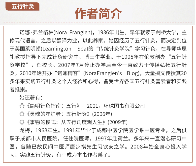 由諾娜·弗蘭格林*的《五行針灸簡明手册》為一本針對福斯的五行針灸普及讀物。