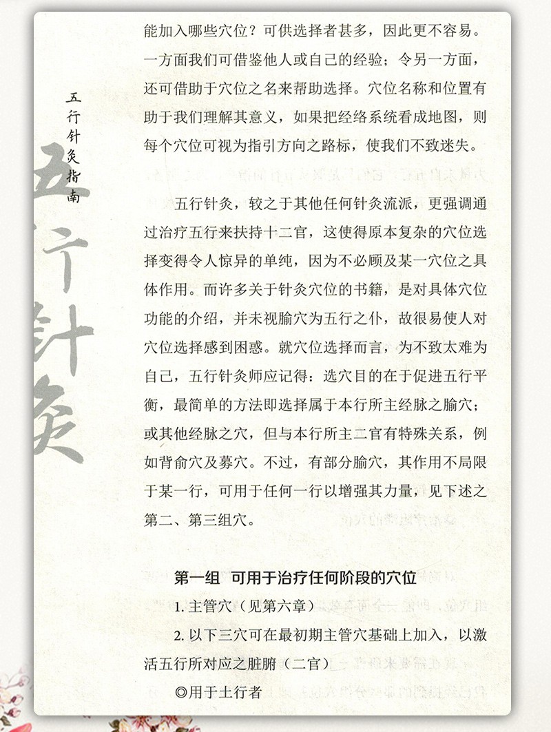 《五行針灸的治療模式》每章標題之下都附一個穴位,是囙此穴名稱的含義與本章內容十分相應,雖在治療上並非嚴格對應,在深層次定有特別關聯,請讀者自行參悟吧!