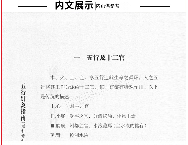 本書旨在把“五行針灸”這一特殊針法介紹給大家,使人們瞭解它的基本原理,並通過書中的一些病案,認識五行針灸的*大益處,繼而願意體驗五行針灸,造福於自身健康。 “五行針灸”幫助人體恢復平衡,不僅能生理上的症狀如頭痛、腰痛等,還能調整心理問題,可抑鬱症或幫助人們*好地面對各種精神壓力,五行針灸囙此成為當今多種複雜疾病的一種非常有效的療法。