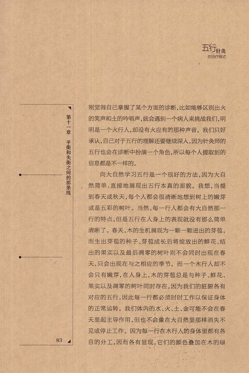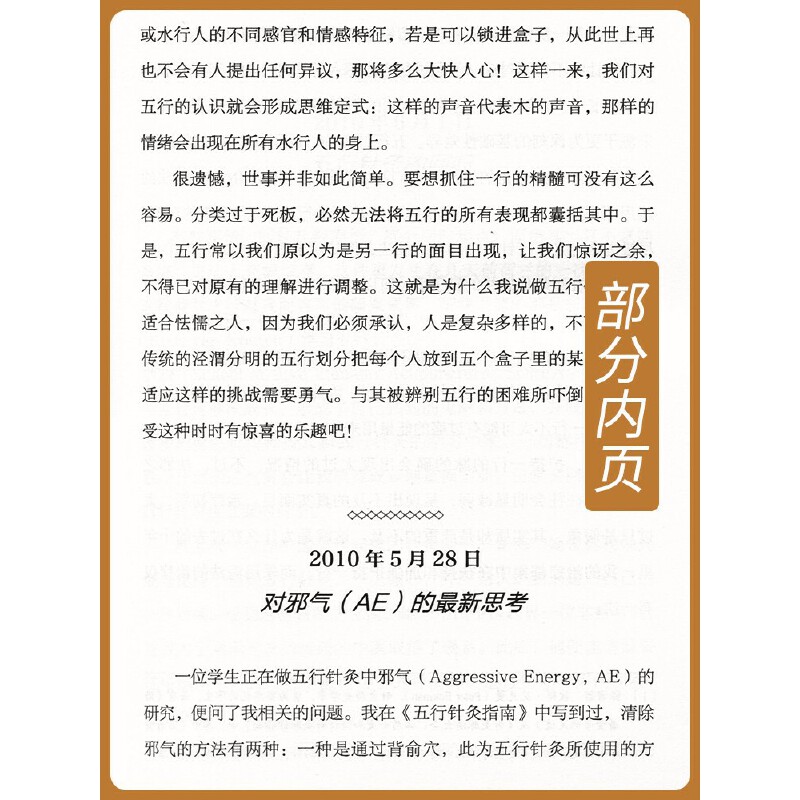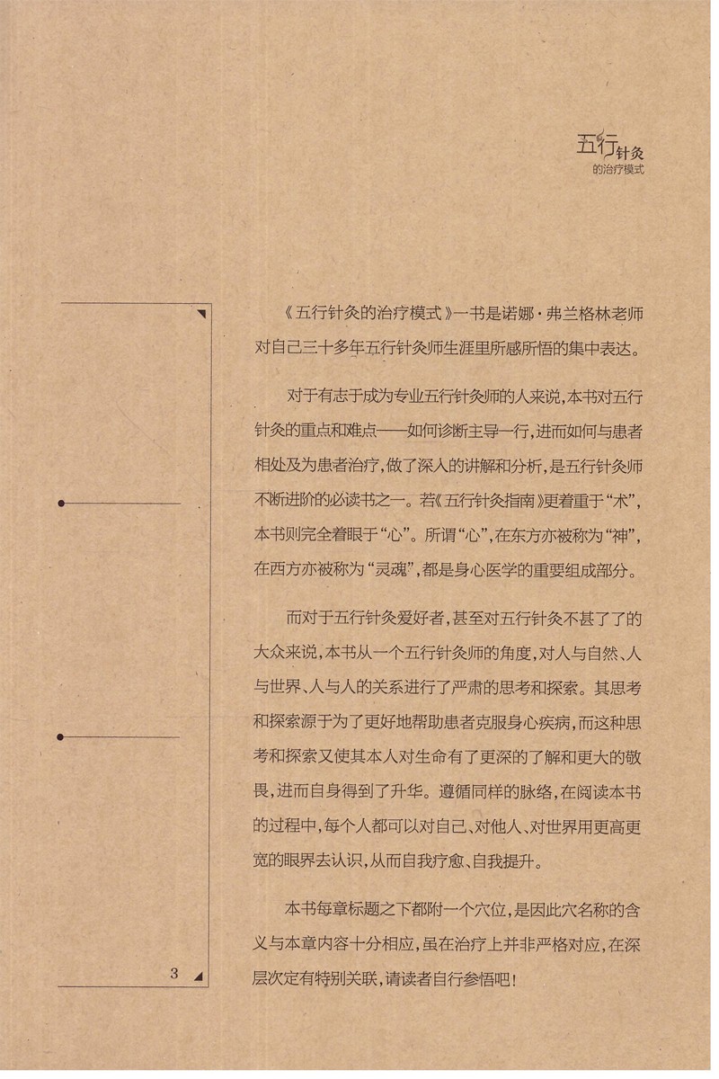 對於有志於成為專業五行針灸師的人來說,《五行針灸的治療模式》對五行針灸的重點和難點——如何診斷主導一行,進而如何與患者相處及為患者治療,做了深入的講解和分析,是五行針灸師不斷進階的必讀書之一。 若《五行針灸指南》更著重於“術”,《五行針灸的治療模式》則完全著眼於“心”。 所謂“心”,在東方亦被稱為“神”,在西方亦被稱為“靈魂”,都是身心醫學的重要組成部分。
