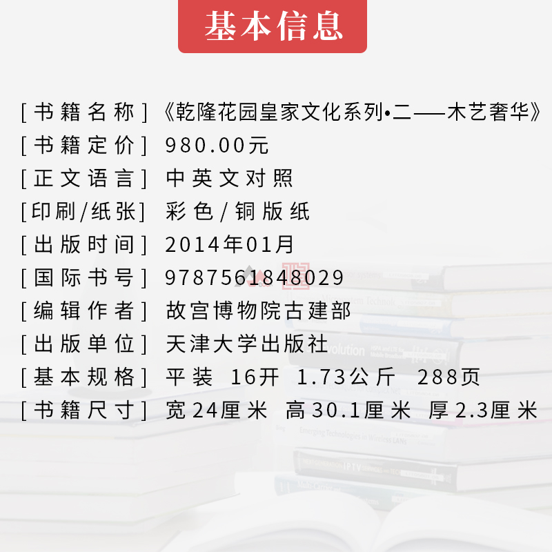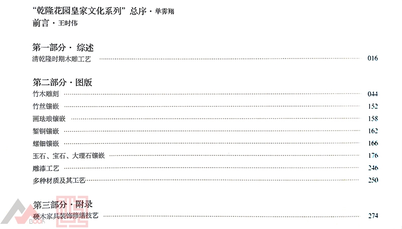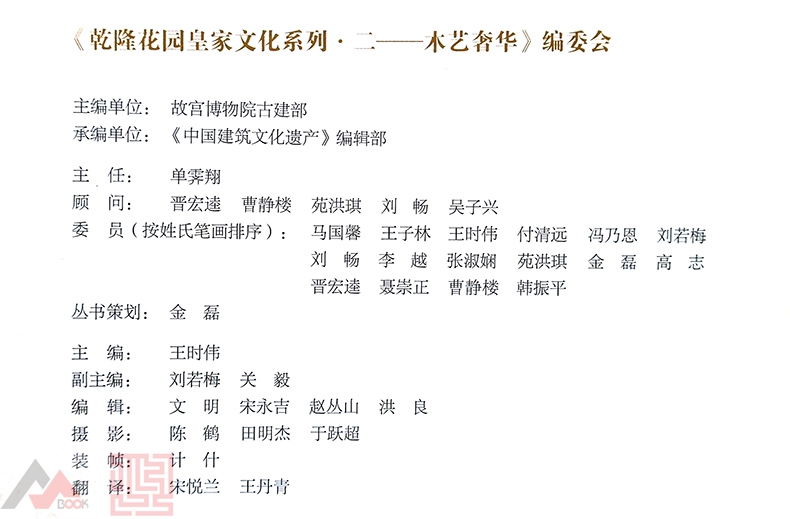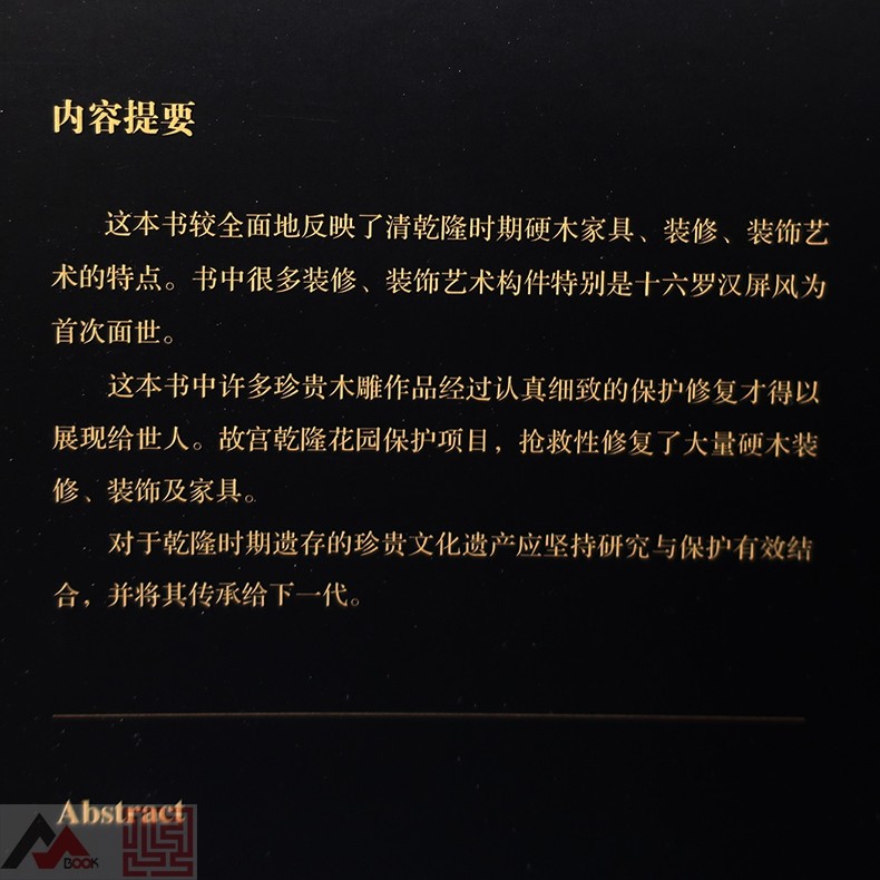 《乾隆花園皇家文化系列(二):木藝奢華》較全面地反映了清乾隆時期硬木傢俱、裝修、裝飾藝術的特點。 書中很多裝修、裝飾藝術構件特別是十六羅漢屏風為首次問世。