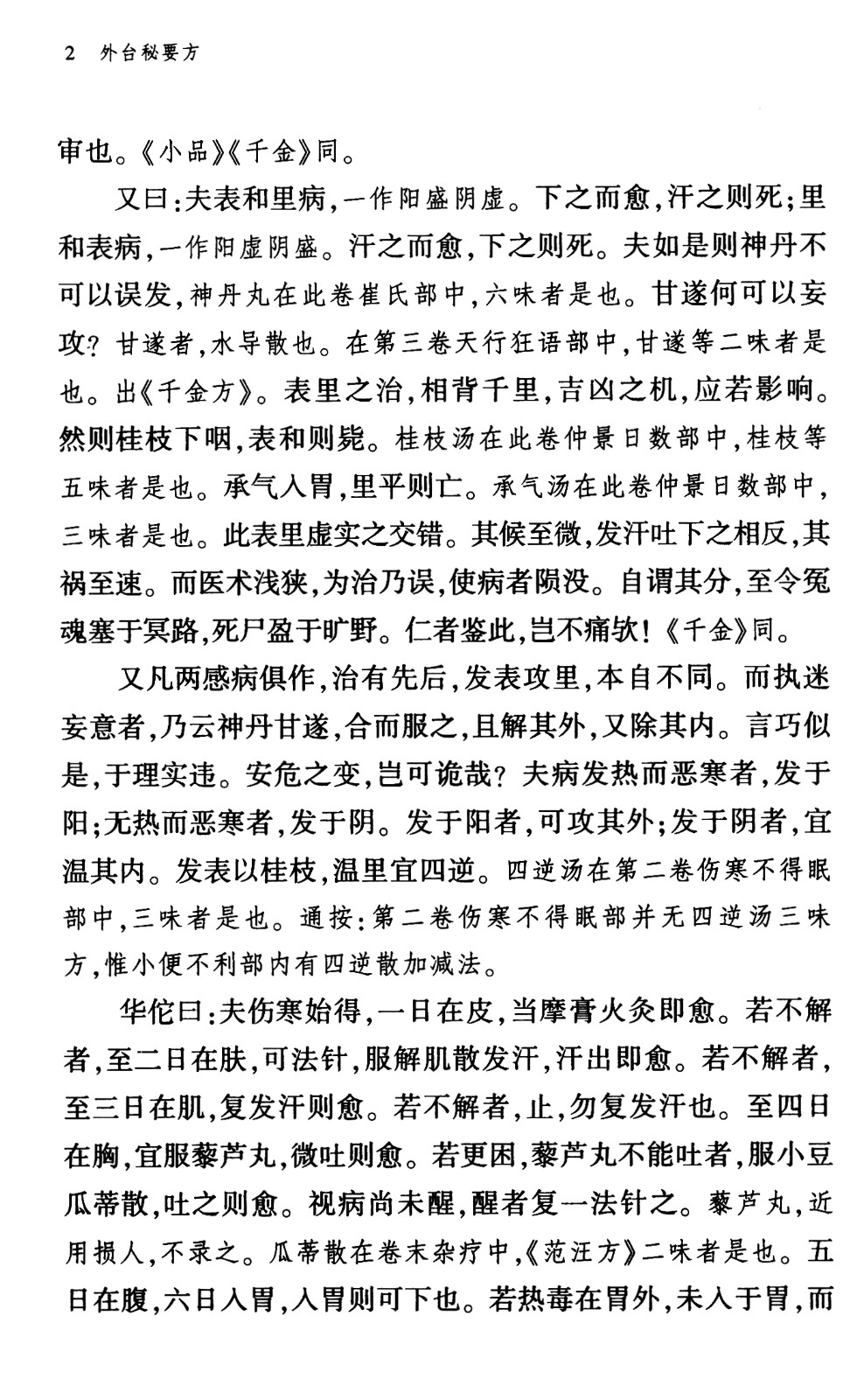 《外台秘要》,方書。四十卷。唐.王燾撰於752年。本書彙集初唐及唐以前的醫學著作。「凡古方纂得五、六十家,新撰者向數千百卷」(自序),進行了編選整理。卷一-二傷寒;卷三-六天行、溫病、瘧病、霍亂等;卷七-二十心痛、痰飲、咳嗽等內科雜病;卷二十一-二十二眼、耳、鼻、齒諸病;卷二十三、二十四癭瘤、癰疽等;卷二十五-二十七痢、痔、外陰諸病;卷二十八-三十中惡、金瘡、惡疾等;卷三十一-三十二採藥、丸散、面部諸病;卷三十三-三十四婦人病;卷三十五-三十六小兒病;卷三十七-三十八乳石;卷三十九-四十明堂灸法。全書共1104門,均先論後方,所載醫方約6千餘首。書中引錄各書均註明出處,頗具文獻價值。本書收羅宏富,內容廣博。為研究我國唐以前醫學的一部重要參考著作。1069年,本書曾經北宋校正醫書局校刻。1640年又經程衍道校勘。現存宋刻本(殘卷)、明刻本、康熙影宋刻本、抄本及日本刻本等。1949年後有影印本。