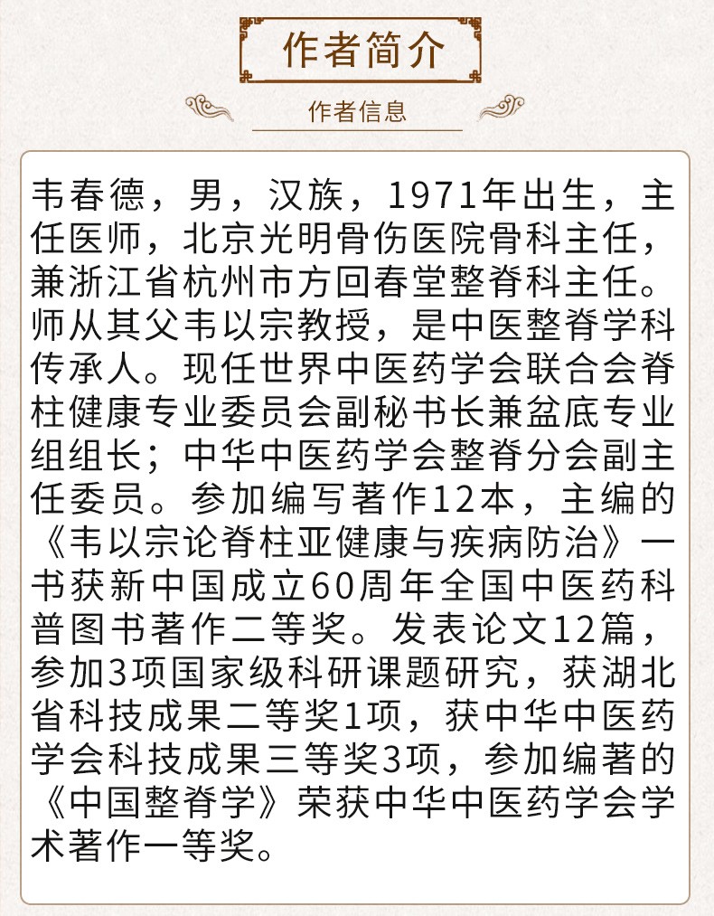 1.韋以宗教授為我國中醫骨傷名家,多年來致力於中國整脊學之研究,發皇古義,融會新知,始終立足於繼承創新。
