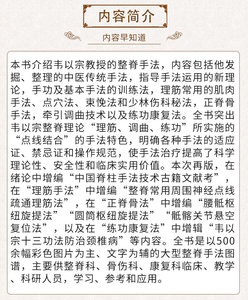 2.全書是以500餘幅彩色圖片為主、文字為輔的大型整脊手法圖譜。