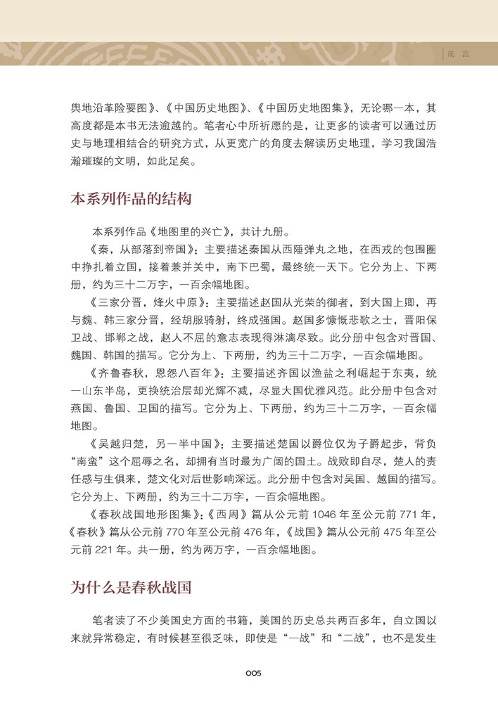 中國歷史長,戰爭多,長期處於冷兵器時代,地緣對中國國家的形成影響極大。 要突出地緣對中國歷史的影響,選擇歷史時期非常重要。 《地圖裏的興亡》系列叢書書以歷史與地理相結合的管道,通過製作地形圖來重寫春秋戰國史,用美式思維將地理與歷史放到同等高度。 左圖右史,帶給讀者更多獨特的思考視角和閱讀體驗。