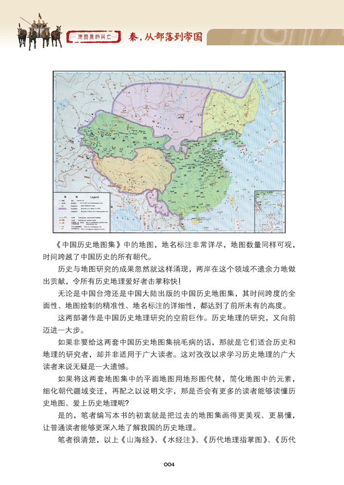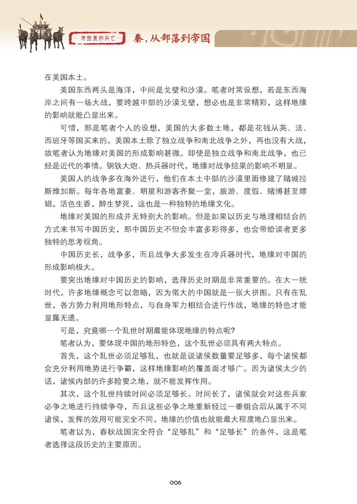 中國歷史長,戰爭多,長期處於冷兵器時代,地緣對中國國家的形成影響極大。 要突出地緣對中國歷史的影響,選擇歷史時期非常重要。 《地圖裏的興亡:秦,從部落到帝國(上)》講述了封建王朝秦是如何作為部落,從西陲彈丸之地,在西戎的包圍圈中掙扎著立國,接著統一關中,南下巴蜀,最終滅六國,統天下。 《地圖裏的興亡》以歷史與地理相結合的管道,通過製作地形圖來重寫春秋戰國史,用美式思維將地理與歷史放到同等高度。 左圖右史,帶給讀者更多獨特的思考視角和閱讀體驗。