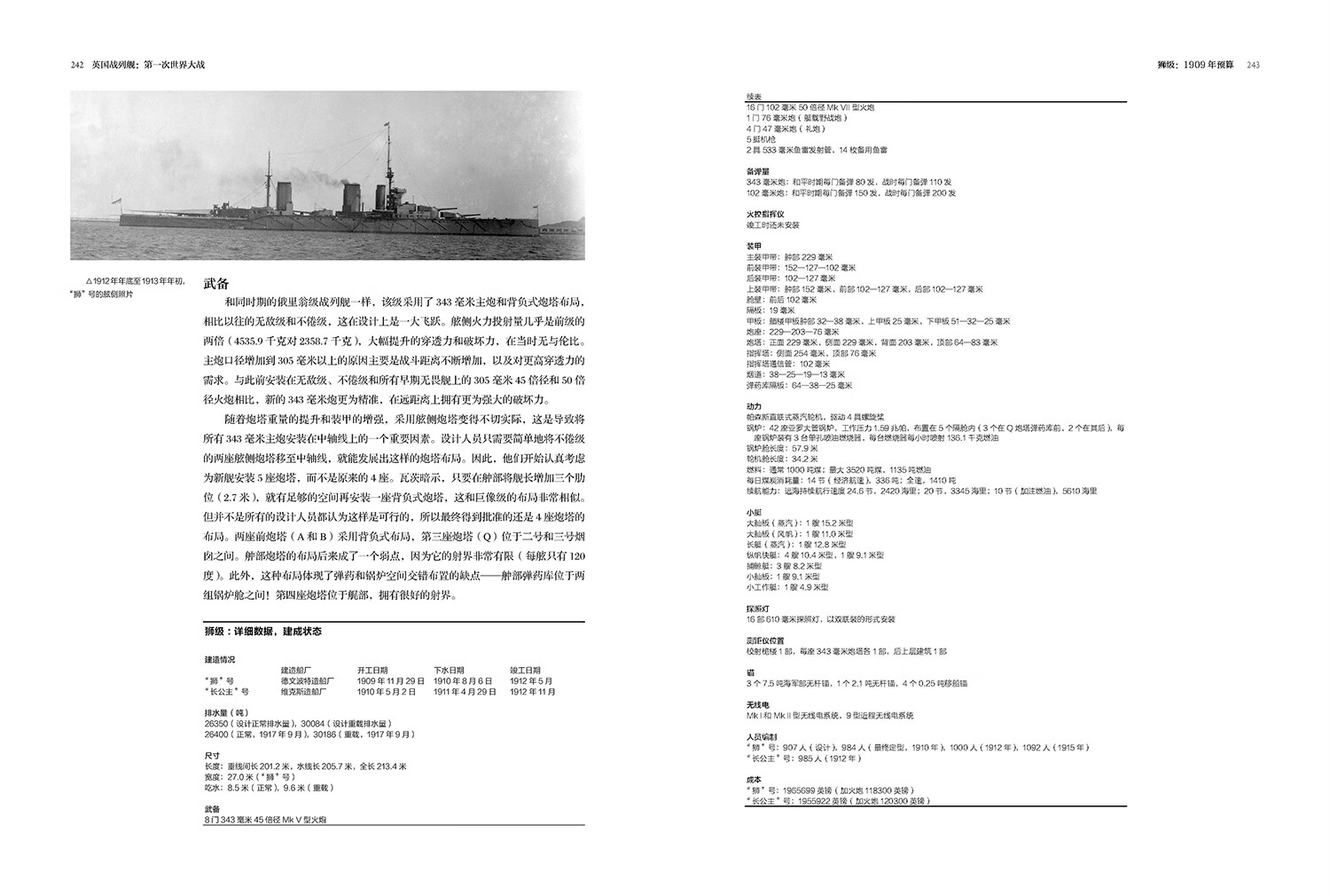 本書以時間順序,逐一回顧了英國在1905—1915年間建造的戰列艦與戰列廵洋艦,它們構成了一戰中英國大艦隊的覈心力量。 作者從設計特點、武器、裝甲、機械動力系統等方面對這些戰艦進行了介紹,總結了各艦在不同時期的外觀變化,並梳理了每艘戰艦的服役與參戰經歷。 文中置入了多種類型的表格,提供了包括尺寸、艦載設備詳情及試航結果在內的豐富數據。 作者挑選了大量歷史照片作為配圖,並繪製了用以展示戰艦結構的線圖,書中還特別附有還原戰艦迷彩塗裝的彩頁。