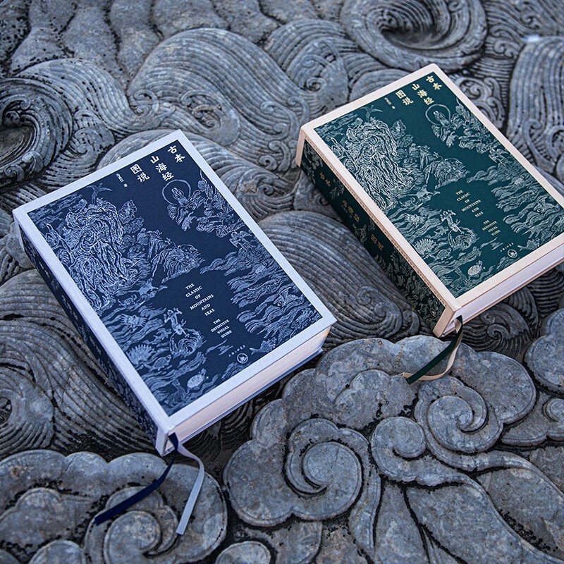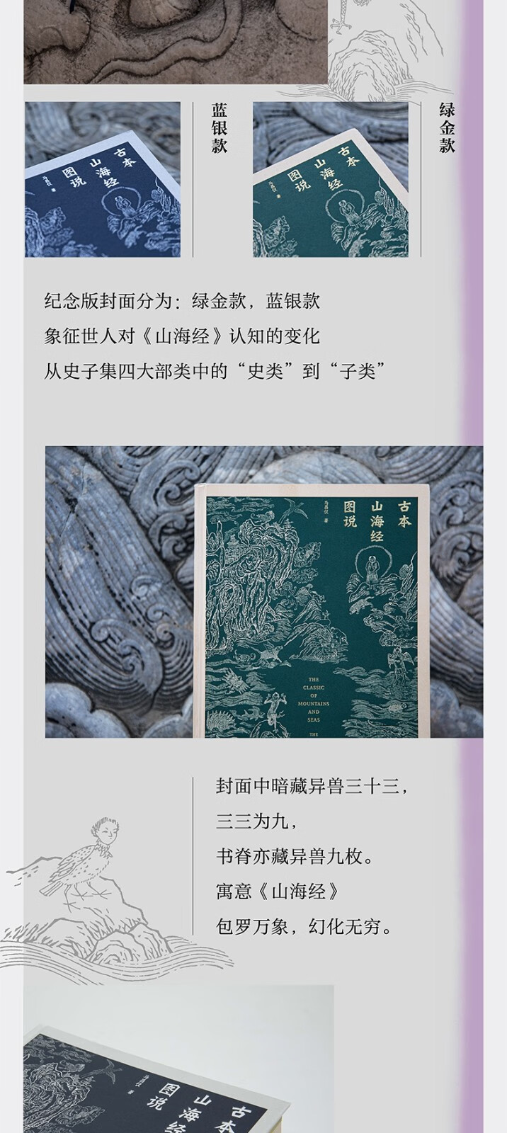 紀念版封面分為綠金款與藍銀款,象徵世人對《山海經》認知的變化:綠色,代表經史子集四大部類中的“史類”,《隋書·經籍志》將《山海經》歸為史部地理類; 藍色,代表四大部類中的“子集”,《四庫全書總目》將《山海經》納入子部小說家類。 封面中暗藏神獸三十三,三三為九,書脊亦藏神獸九枚。 以九九之數寓意《山海經》包羅萬象,幻化無窮。