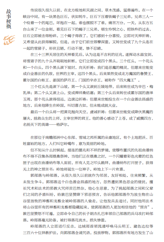 本書用藏民族的繪畫形式唐卡,展現藏民族的民間藝術高成就的代表《格薩爾》。 近兩百幅唐卡作品,講述英雄格薩爾從天界到人間,降妖除魔,懲惡揚善,造福百姓,完成大業,後又返回天界的全過程。 讀者可以在欣賞唐卡藝術精品的同時,領略世界長史詩的風采。