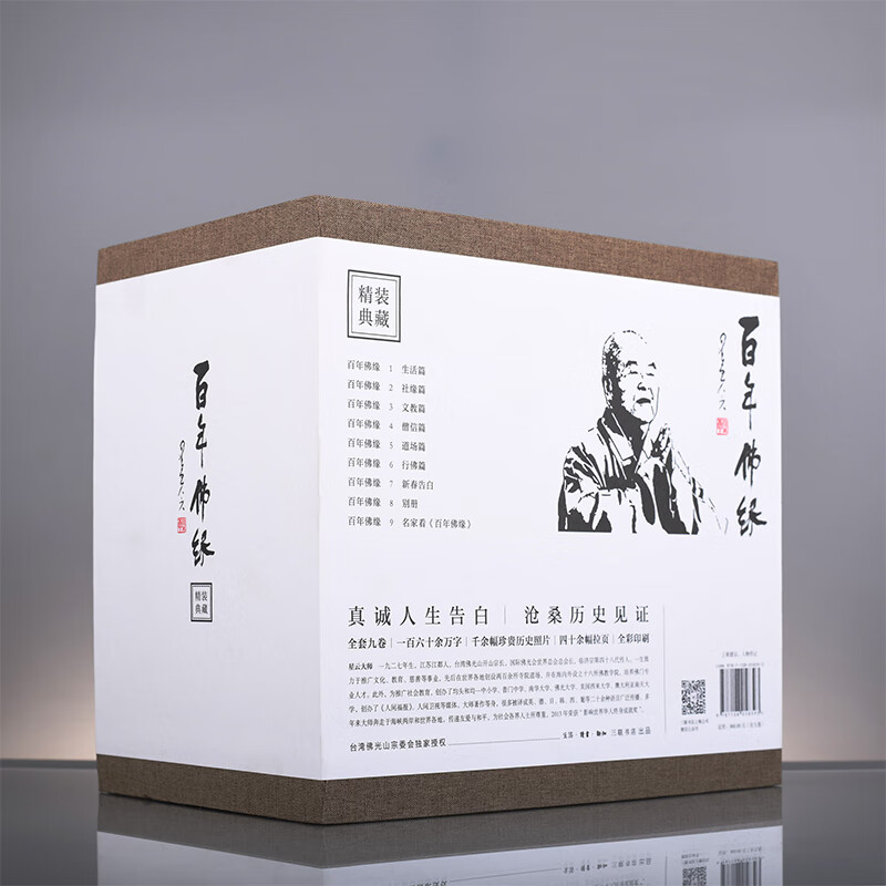 精裝典藏版《百年佛緣》(共九卷)保存了第一版中的完整內容,更正了第一版當中的一些地名、時間和個別文字方面的差錯。 封面做了全新的設計,特別是新增了結實的函套,方便讀者整套保存。 為了感謝讀者朋友,書內還附贈有星雲大師一筆字的精美相框和菩提葉,非常珍貴。 在函套外還使用了更好的外包裝,保證套書運輸過程的安全。