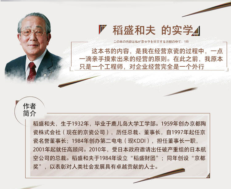 1932年出生於日本鹿兒島,1955年畢業於鹿兒島大學工學部。1959年創辦京都陶瓷株式會社(現在的京瓷公司),1984年創辦第二電電株式會社(現名KDDI,目前在日本為僅次於NTT的第二大通信公司),這兩家公司都進入了世界500強。在日本四大「經營之聖」(另三位分別是松下公司的創始人松下幸之助、索尼公司的創始人盛田昭夫、本田公司的創始人本田宗一郎)中,他是年齡小的也是目前W一在世的一位。2010年2月1日,78歲的稻盛和夫在全世界的矚目下正式出任破產重建的日本航空公司董事長,在運用了稻盛和夫的經營哲學後,奇蹟很快出現。到2010年11月,日航的盈利已達1400億日元,全世界為之驚嘆。