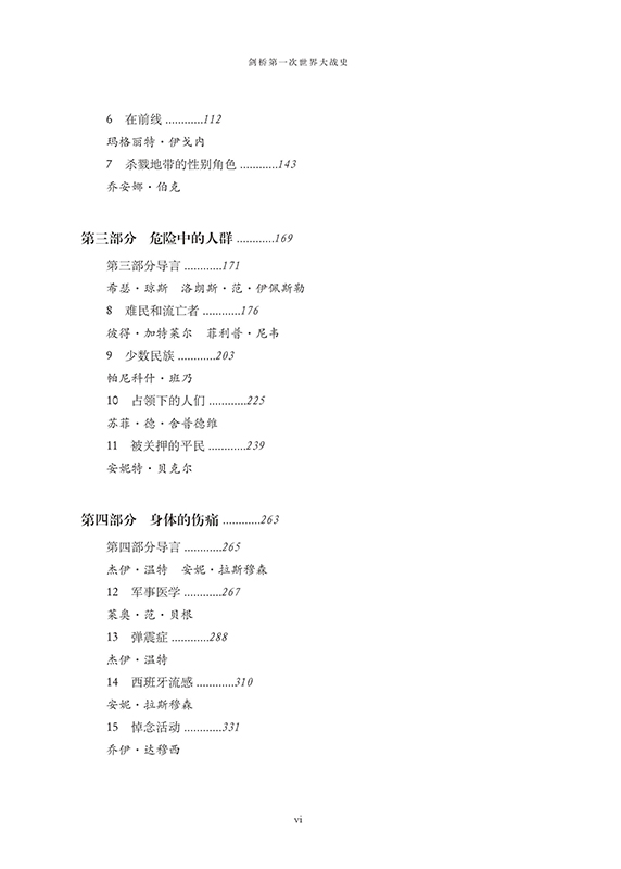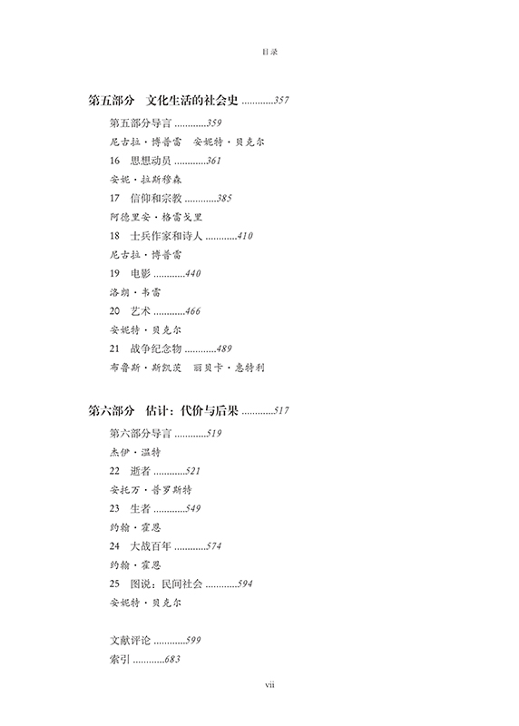 各章作者從全球性的宏觀視角出發,審視了戰爭期間的人口流動、家庭關係變遷、不同家庭成員的境遇、社會生產分工的變化、難民的產生和變動、病患及醫療科技的進展等社會生活諸方面,此外,還從不同角度概述了各國的文化生活,包括戰爭期間的軍人作家的活動,各國的文宣行為,電影、雕塑、 悼念等活動。