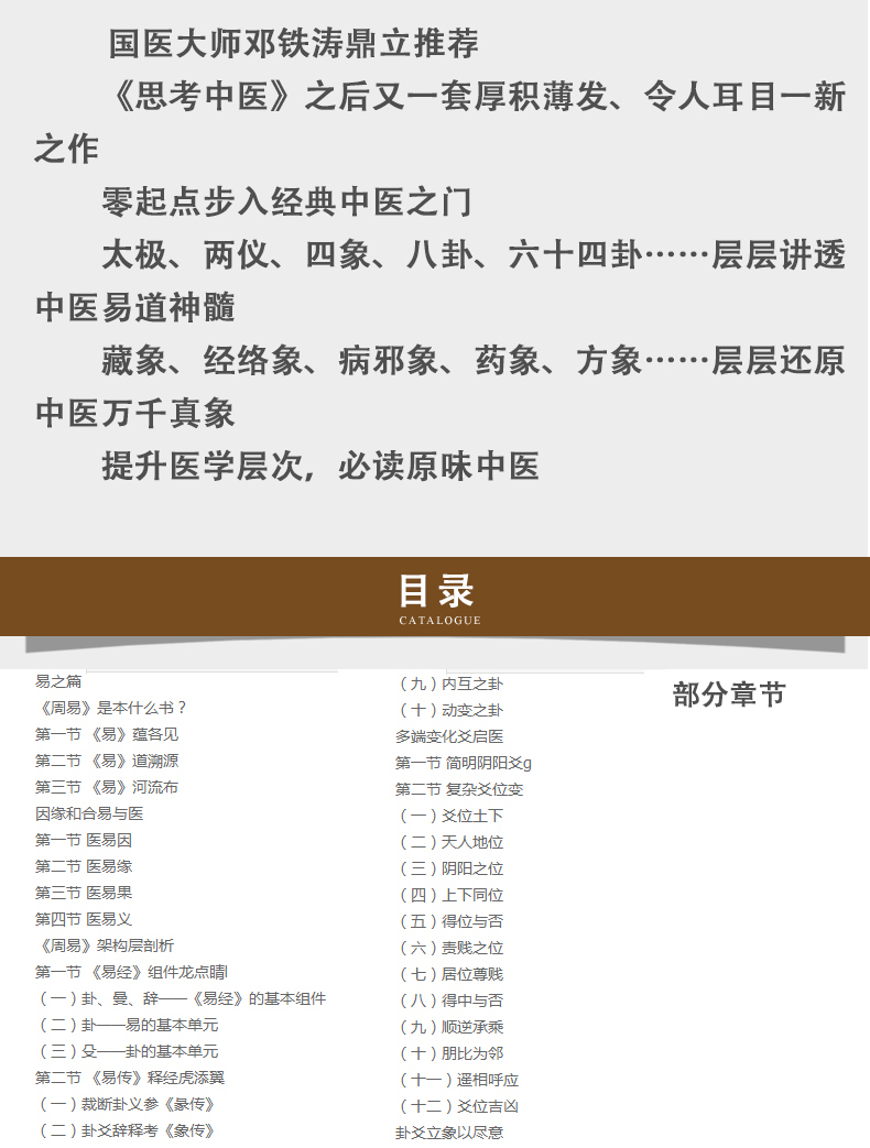《易之篇》主要從《易》的基本結構與基本知識入手,從兩儀、四象、八卦到六十四卦,層層揭開卦爻關係,並與醫學內容相互印證,最終落到醫學實踐的運用上,企望授人以漁。