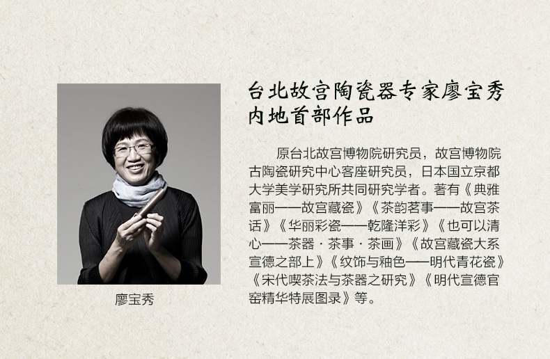 廖寶秀,原臺北故宮博物院研究員,故宮博物院古陶瓷研究中心客座研究員,日本國立京都大學美學研究所共同研究學者。 著有《典雅富麗――故宮藏瓷》《茶韻茗事――故宮茶話》《華麗彩瓷――乾隆洋彩》《也可以清心――茶器?茶事?茶畫》《故宮藏瓷大系宣德之部上》《紋飾與釉色――明代青花瓷》《宋代噢茶法與茶器之研究》《明代宣德官窑精華特展圖錄》《中華五千年文物集刊?瓷器篇三――汝窑?定窑》 等專書及論文七十餘篇。