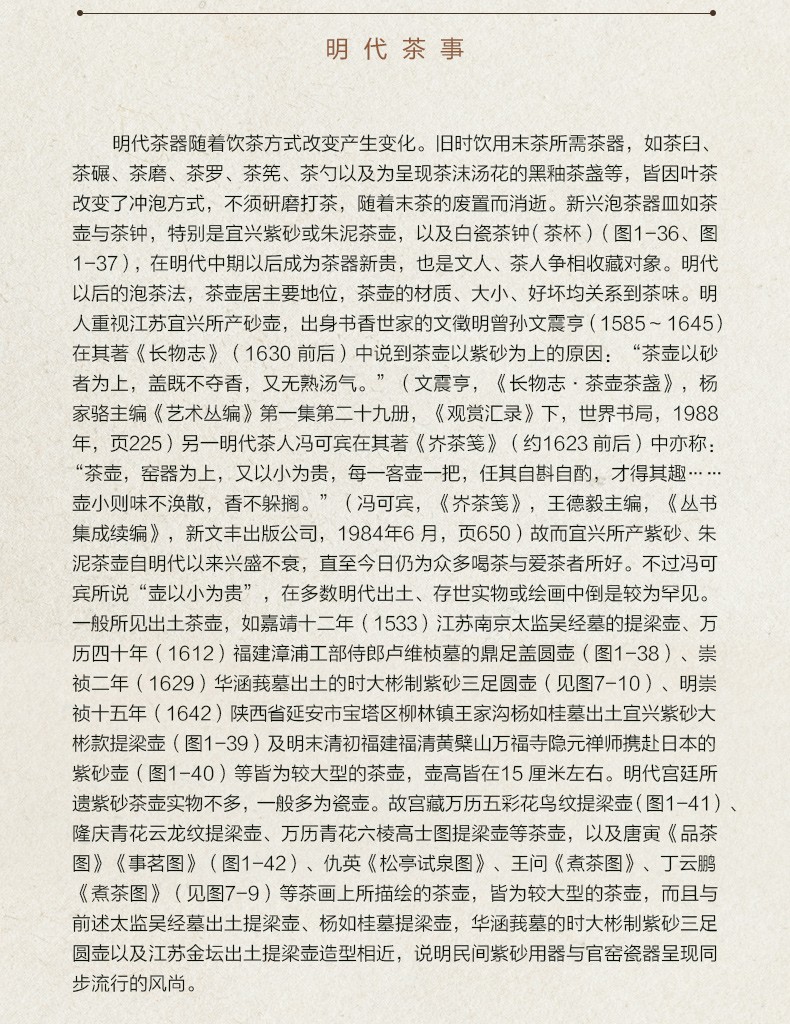 廖寶秀著的《曆代茶器與茶事》精選200餘件歷代茶器、茶畫,呈現一部中國茶事的歷史。 作者在臺北故宮博物院任研究員期間,遍閱故宮及各地博物館有關茶事的文獻、藏品,並使用器物、文獻、書畫互證的研究方法,如實還原唐宋至明清的飲茶風尚。 本書是她一系列有關研究的集結,向普通讀者介紹當時近期新的研究成果及作者的觀點。 書在臺灣出版後,獲得了頗高的讚譽,再版數次,其“如白描一般”的敘述手法,引領讀者進入古代飲茶的情境之中,瞭解不同歷史時期的古人使用何種茶具、採取何種方法飲茶,至今讀來仍令人興味盎然。
