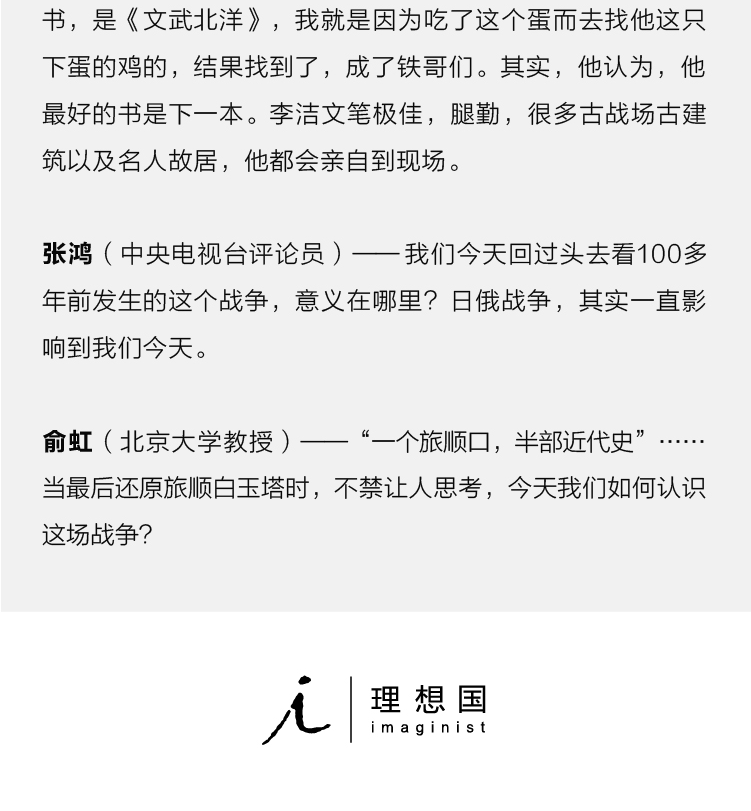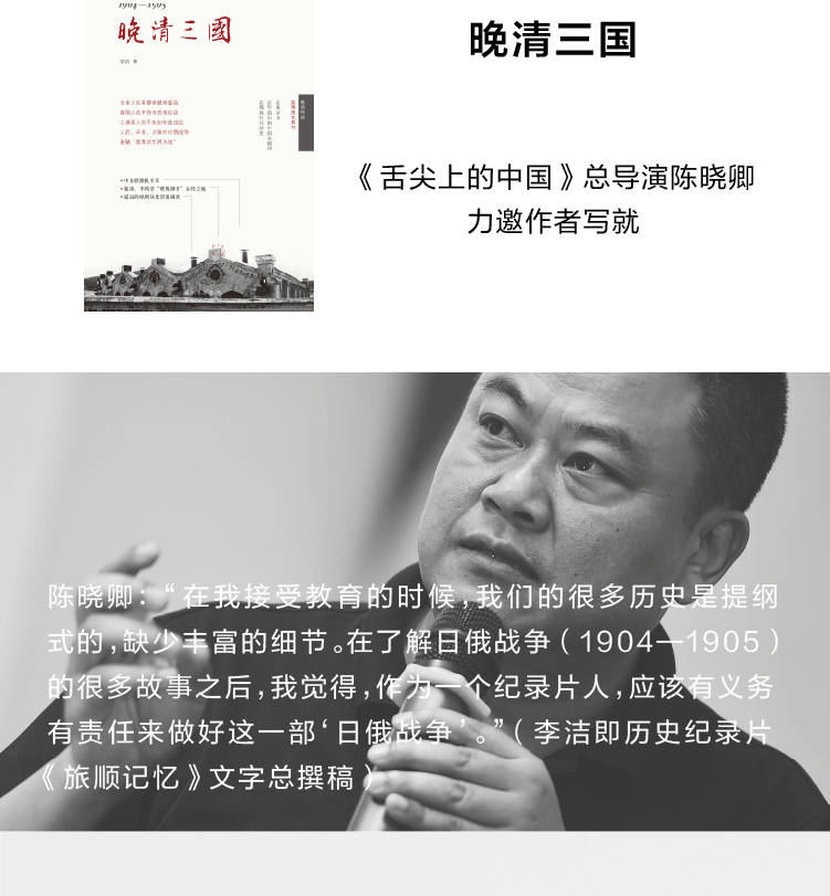 ★《晚清三國》,是《舌尖上的中國》總導演“力邀”作者寫成的——“舌尖上”總導演陳曉卿在新聞發佈會上自曝更愛歷史,《晚清三國》即為陳曉卿紀錄片團隊原名《旅順記憶(1904—1905)》的文字總撰稿。 這是一部關於日俄戰爭(1904—1905)的史詩級紀錄片,對歷史資料的分析等,被“知乎用戶”贊為分分鐘碾壓日本方面製作的(包括NHK)任何一部日俄戰爭紀錄片! 獲CCTV紀錄片頻道、人民日報、東方歷史評論、新浪軍事、B站up主、百度吧主、豆瓣讀友等好評。