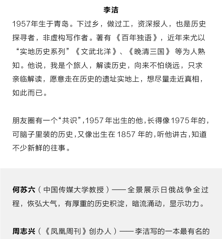 李潔,1957年生於青島,下過鄉,做過工,資深報人,也是歷史探尋者,非虛構寫作者。 著有《百年獨語》,近年來尤以“實地歷史系列”《文武北洋》、《晚清三國》等為人熟知。 他說,我是個旅人,解讀歷史,向來不怕繞遠,只求親臨解讀,願意走在歷史的遺址實地上,想儘量走近真相,如此而已。