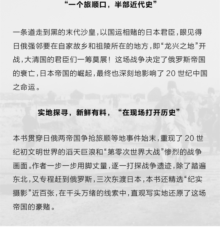 ★《晚清三國》,實地探尋,“在現場打開歷史”——發現歷史,新鮮有料! “一個旅順口,半部近代史”,本書貫穿日俄兩帝國爭搶旅順等地事件始末,重現了20世紀初文明世界的滔天巨浪和“第零次世界大戰”慘烈的戰爭畫面。 史料浩如煙海,作者一步一步用脚丈量,逐一打探戰爭遺跡,除了踏遍東北,又專程趕到俄羅斯,三次東渡日本,本書還精選“紀實攝影”近百張,在千頭萬緒的線索中,直觀寫實地還原了這場帝國的豪賭。 打開歷史的管道變了,“實地歷史”,漲知識!
