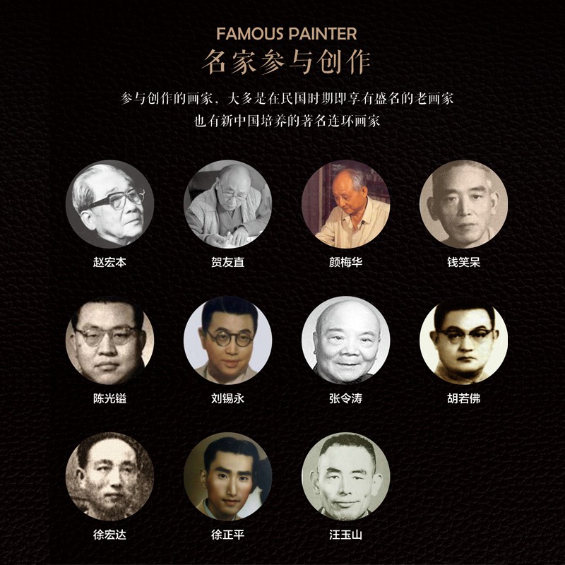 數十比特名家參與創作——參與創作的畫家,大多是在民國時期即享有盛名的老畫家,也有新中國培養的著名連環畫家,包括趙宏本、賀友直、顏梅華、錢笑呆、陳光鎰、劉錫永、張令濤、胡若佛、顏梅華、徐宏達、徐正平、汪玉山、馮墨農等。