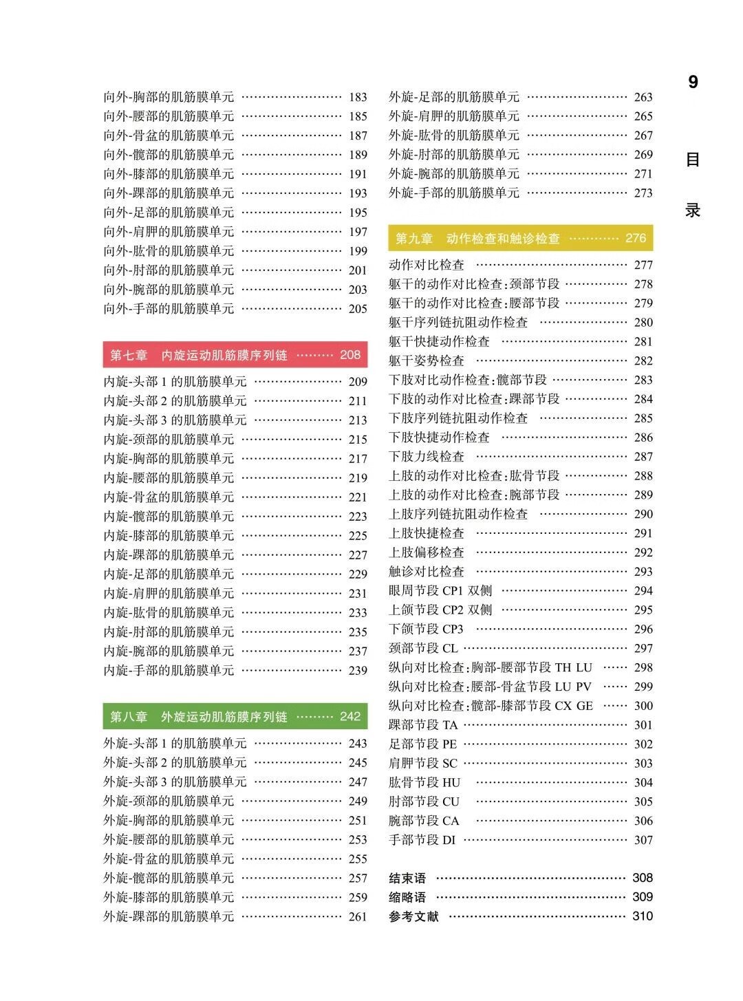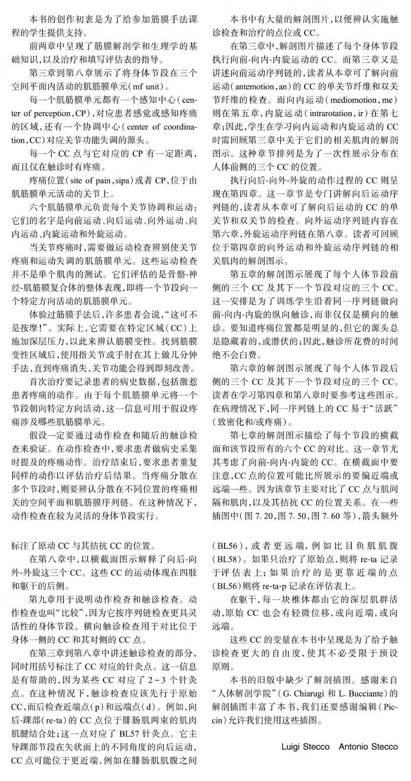 本書以科學的研究證據為基礎,全面介紹如何應用Luigi Stecco創建的筋膜手法。本書向手法治療師、醫師、患者、運動訓練教練及想要了解和學習筋膜手法的人介紹了關於筋膜的充足的知識。這本書內容排版很有邏輯性,前3章介紹了筋膜手法的發展歷史、筋膜解剖學( 第2 章) 和生理學( 第3 章),其他章節則主要圍繞筋膜手法技術展開,如第4 章重點介紹了筋膜手法的關鍵概念;第5 章結合了一些病例;第6 章主要提到內部功能障礙;第7 章講述獸醫應用筋膜手法。