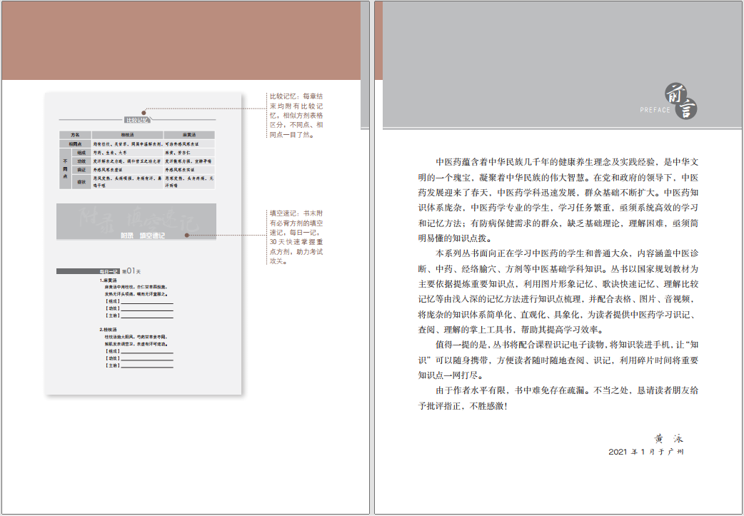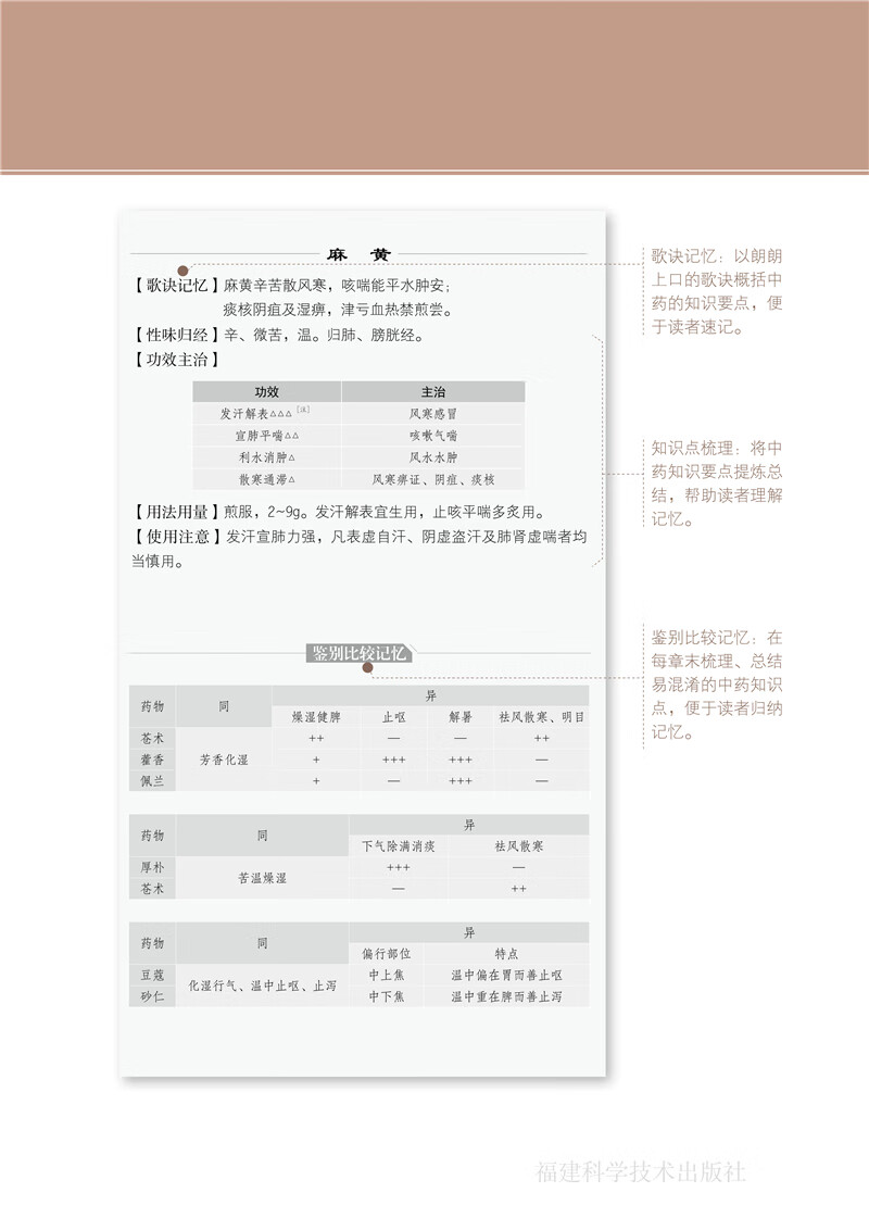 本書在開篇創造性地將精美中藥飲片圖按內文收錄順序排列成“圖片形象記憶”圖,讓讀者對各種藥材有初步的圖形印象。 進入正文,第一章以歌訣的形式介紹了中藥的效能及配伍等入門知識。 餘下各章對329味常用中藥作了較系統的介紹,內容包括性味歸經、功效主治、用法用量和注意事項等,系統地歸納了《中藥學》教材中的知識點,還配有中藥歌訣等輔助理解、加深記憶,並在每章結尾配有本章中易混藥物的鑒別用藥表格。 本書後還附有電子書二維碼供掃碼使用,真正實現掌上閱讀和記憶。