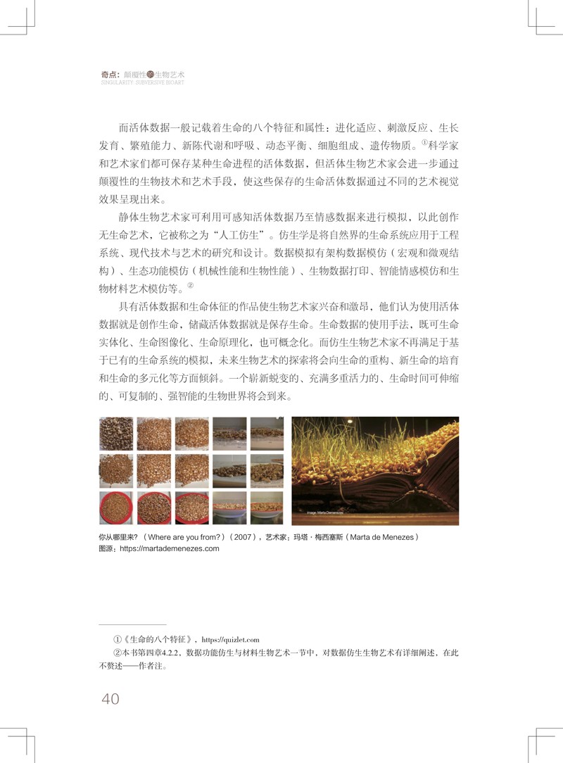 第4章:主要簡介了中國和世界當代生物藝術之概況。 從生物技術性質和生物藝術展示特質上,給予了詳備而細緻的歸納和分類,對生物技術和藝術兩者的平行推薦闡揚都非常到位。