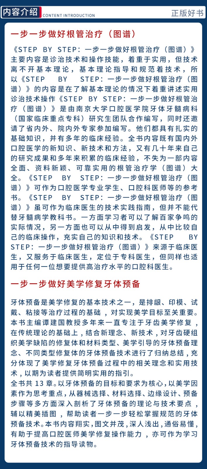 《Step by Step:一步一步做好根管治療(圖譜)》主要內容是診治技術和操作技能,著重於實用,但技術離不開基本理論,基本理論指導和規範著技術,所以《Step by Step:一步一步做好根管治療(圖譜)》的內容是在了解基本理論的情況下著重講述實用診治技術操作。