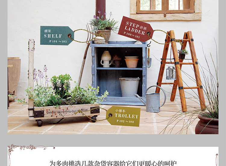 如果你也如此,不妨翻開這本書,一同在花園的懷舊時光中穿梭,領略滿是心儀古董雜貨的個性花園的魅力,看看專家推薦了哪些提升庭院格調的***雜貨,又可以用哪些適合不同場景的小物來打造迷人角落,再親手製作幾款做舊風的實用雜貨吧,為多肉挑選幾款雜貨容器給它們更暖心的呵護,從懷舊風格的植物圖鑑中挑選植物佈置庭院,享受被綠意環繞著只屬於你的那方天地。