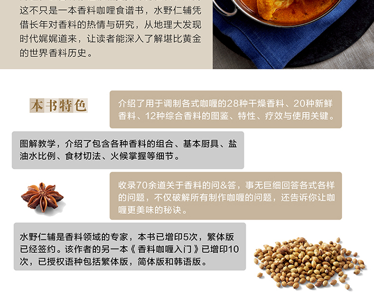 一本從初學者到專業級必備的香料咖哩食譜書!集日本香料咖哩專家大成之作,堪稱香料咖哩百科事典。本書首先從香料的基礎知識介紹開始,包括29種干燥香料、20種新鮮香料、12種綜合香料的圖鑑、特性、療效與使用部位與關鍵,而這些香料就是調整各式各樣咖哩的基礎關鍵。另外書中也收錄70餘道關於香料的問答,事無鉅細回答各式各樣的問題,不僅破解所有製作咖哩的問題,還告訴你讓咖哩更美味的秘訣。然而這不只是一本香料咖哩食譜書,水野仁輔憑藉長年對香料的熱情與研究,從地理大發現時代娓娓道來,讓讀者能深入了解堪比黃金的世界香料歷史。