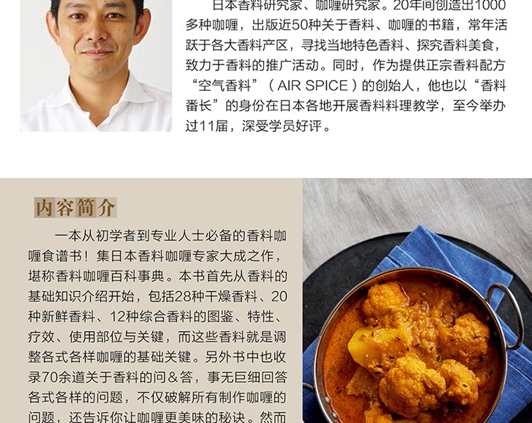 日本香料研究家、咖哩研究家。 20年間創造出1000多種咖哩,出版近50種關於香料、咖哩的書籍,常年活躍於各大香料產區,尋找當地特色香料、探究香料美食,致力於香料的推廣活動。同時,作為提供正宗香料配方“空氣香料”(AIR SPICE)的創始人,他也以“香料番長”的身份在日本各地開展香料料理教學,至今舉辦過11屆,深受學員好評。