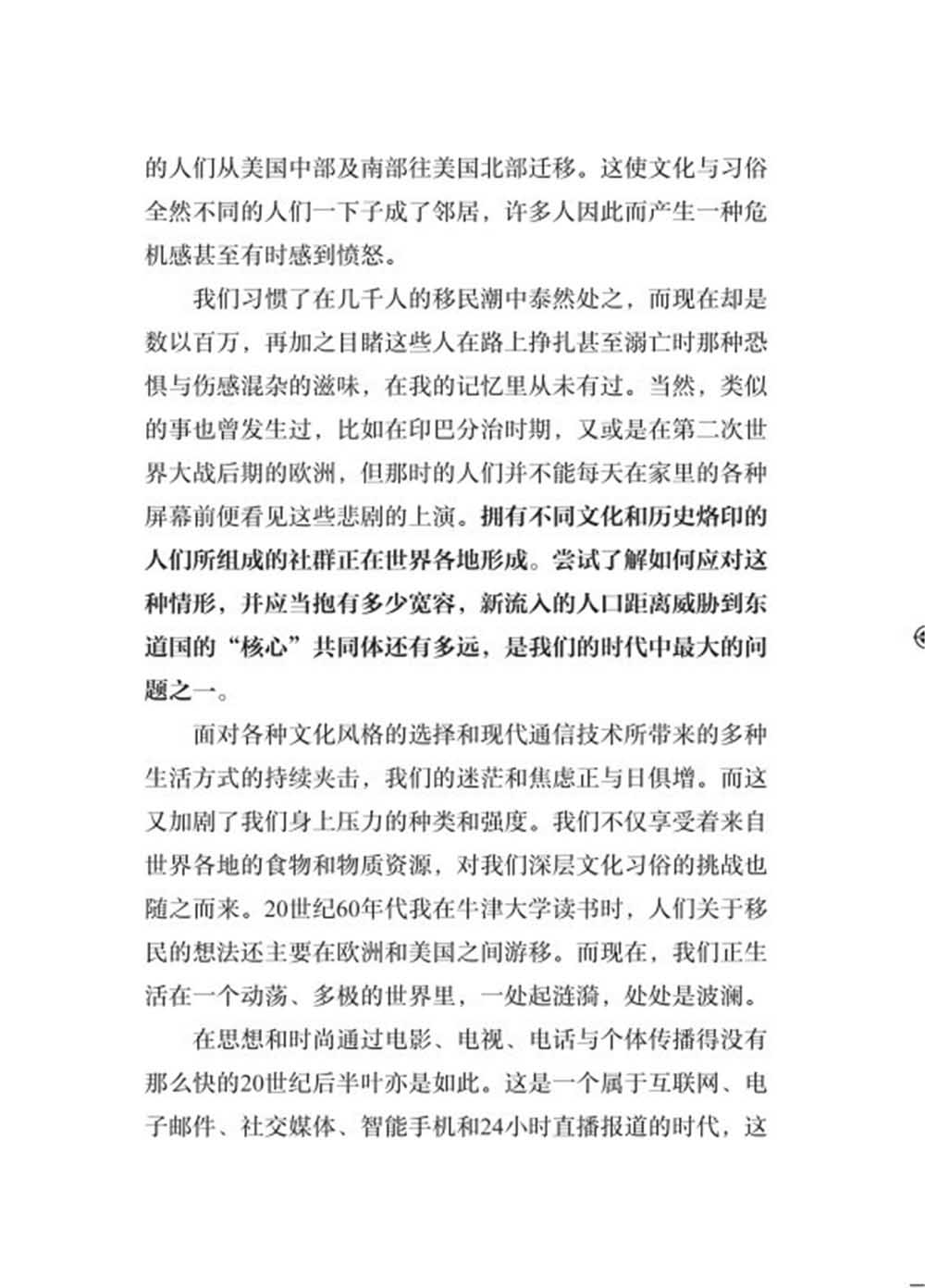 2.擁有不同文化和歷史烙印的人們所組成的社群正在世界各地形成。嘗試了解如何應對這種情形,並應當抱有多少寬容,新流入的人口距離威脅到東道國的「核心」共同體還有多遠,是我們的時代中Z大的問題之一。