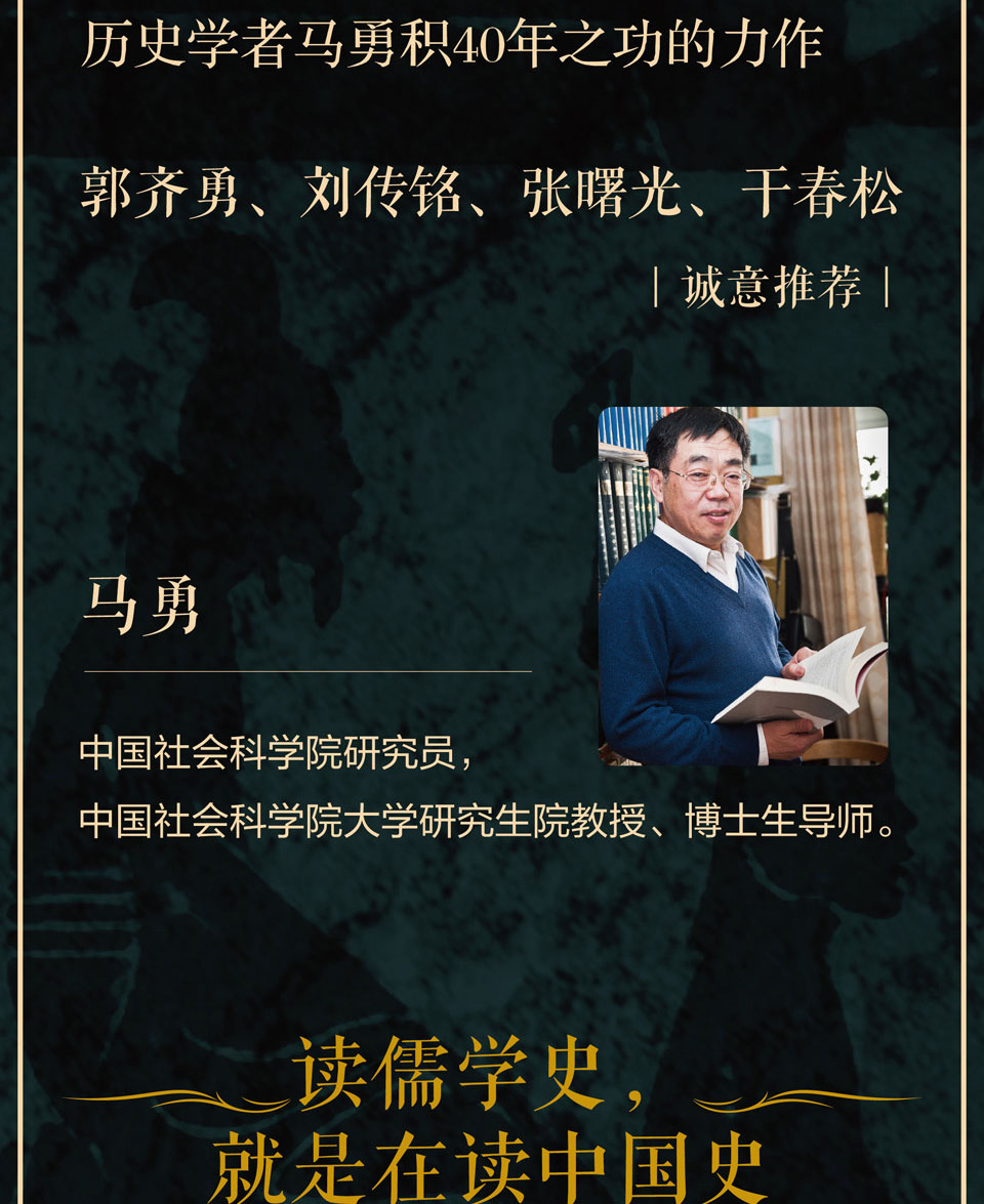 歷史學者馬勇先生積40年之功,從大歷史的視角,給3000年中國儒學的發展做了鳥瞰式的描述,為讀者建構了 個宏觀框架:按照時間順序,逐 介紹各個時代的儒學大師的主要成就與觀點、儒家流派的基本情況、儒學與其他思想流派的交流與互補;剖析儒學是如何影響政治格局與制度的,又是如何影響社會文化與民族性格的。