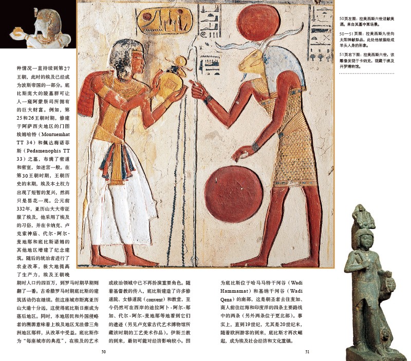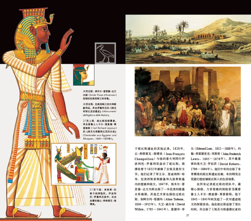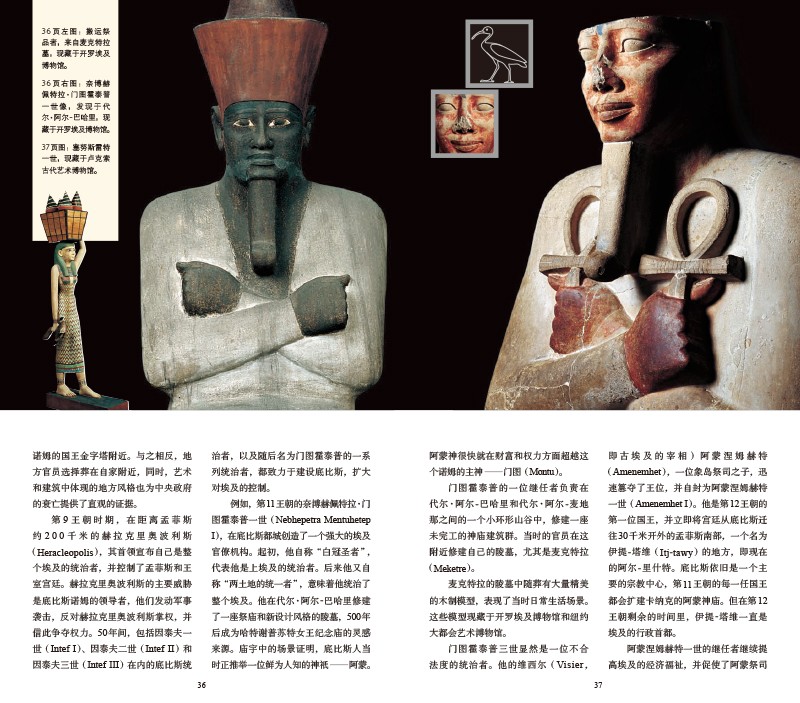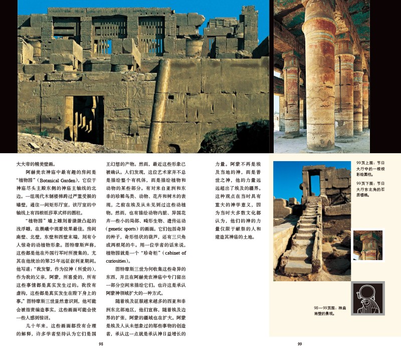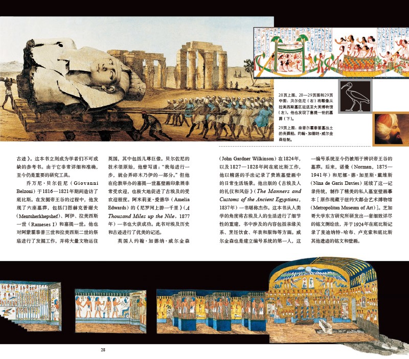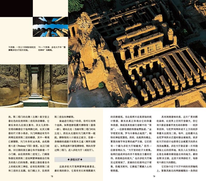 全書涵蓋大量精美圖片,都是各個時期的學者們在神廟與陵墓現場拍攝的照片,有總覽全景的鳥瞰圖,也有刻畫墓室壁畫的細節圖,更有許多不開放區域的珍貴圖片。 圖文並茂,解讀詳略得當,讓讀者在賞圖品文中完成對埃及歷史奇迹的鑒別與欣賞。