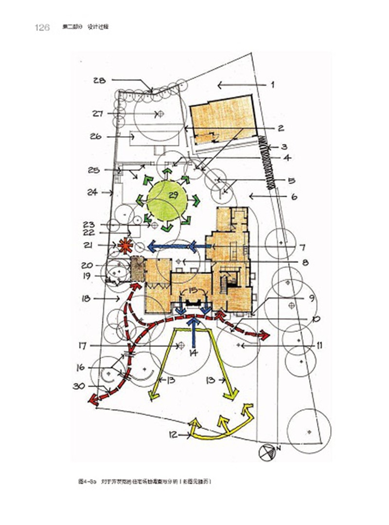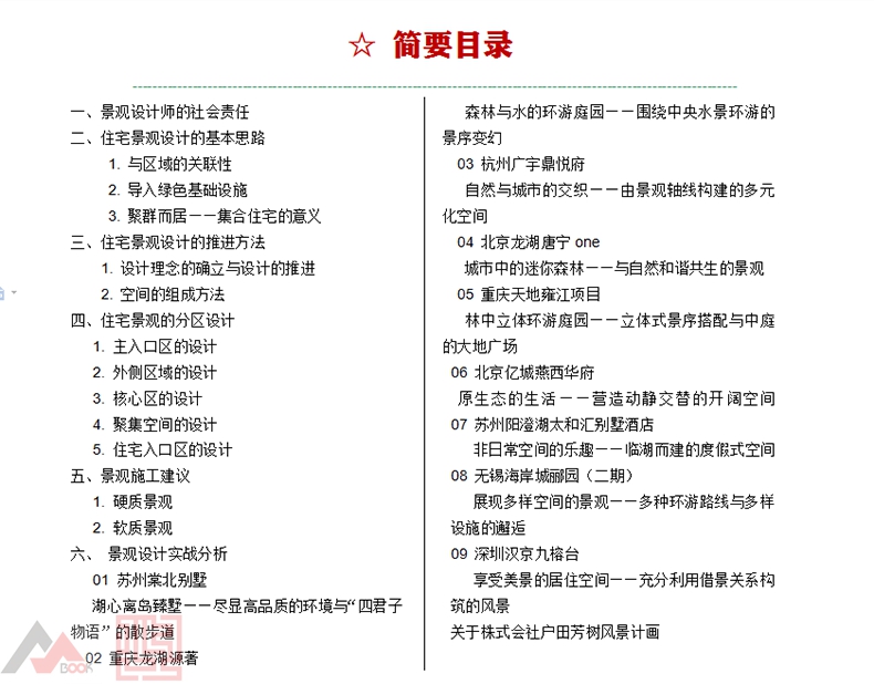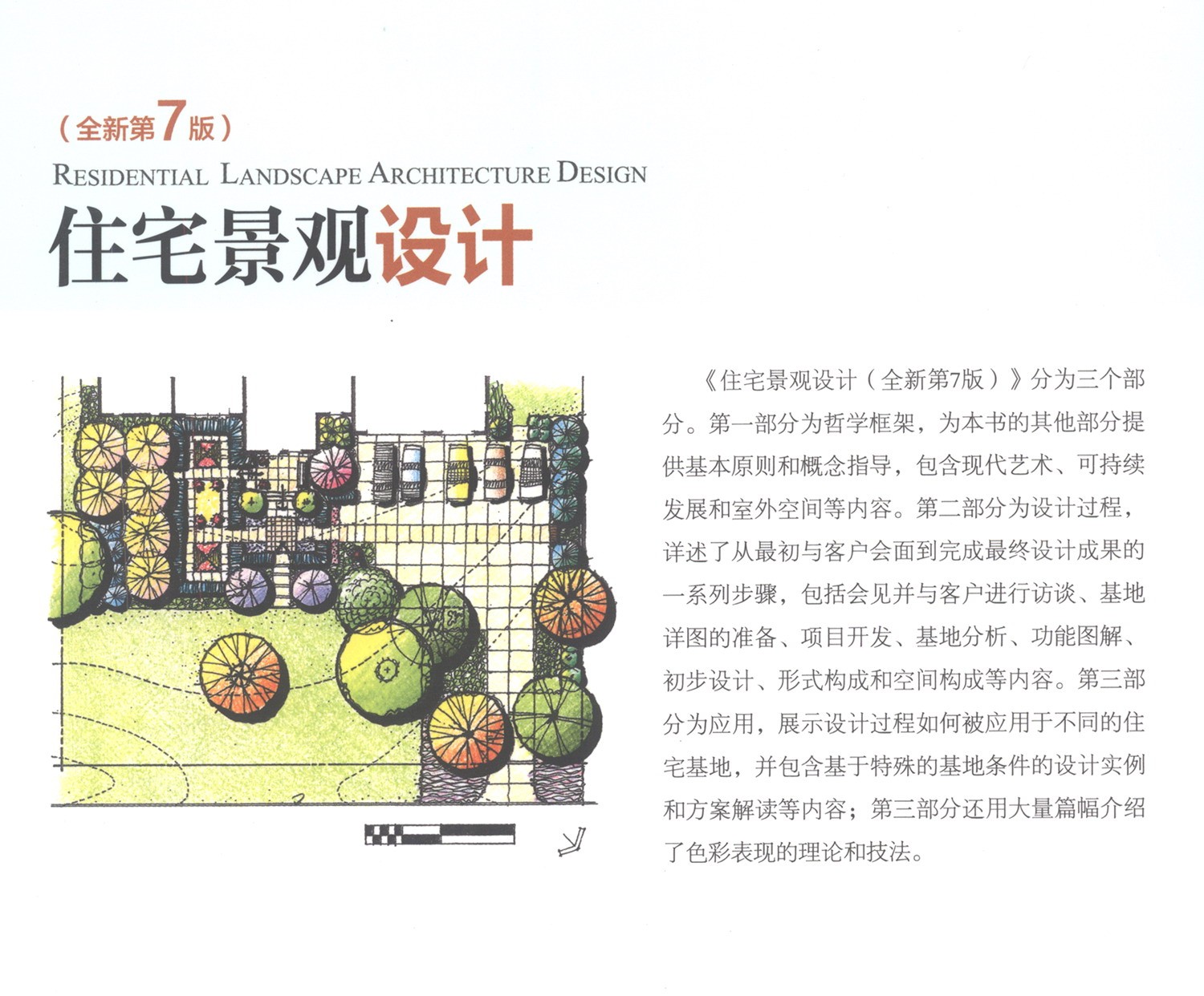 本書分為三個部分。 第一部分是哲學框架,提供基本原則和概念指導,並包含有關現代藝術、可持續發展和室外空間等內容的章節。 第二部分是設計過程,詳述了從最初與客戶會面到完成最終設計成果的一系列步驟,包括會見並與客戶進行訪談、基地詳圖的準備、專案開發、基地分析、功能圖解、初步設計、形式構成和空間構成等章節。 第三部分是應用,證實設計過程是如何被應用於不同的住宅基地,並包含基於特殊的基地條件的設計實例和方案解讀等內容,還有大量篇幅介紹色彩表現的理論和技法。