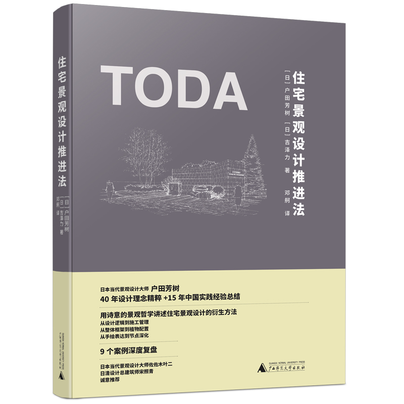 戶田芳樹先生在中國開展景觀設計工作已有15年,在本書中他將自己推進設計的方法結合優秀的住宅景觀作品娓娓道來。 從設計邏輯到施工管理、從整體框架到植物配寘、從手繪表達到節點深化,九個案例的深度複盤給讀者提供了走近實際項目設計的珍貴機會。 雖然現時用電腦效果圖表現已是主流,但在設計過程中,戶田事務所的設計思路一般仍通過手繪提案進行表現。 有業內人士曾評估過,其手繪的優點更多的是服務於設計,不單單是為了追求藝術而去創作,有理性的線條和感性的色彩。 而本書更是在手繪的基礎上新增了擴初設計和節點設計的詳圖,無論是對專業人士還是業餘愛好者都是一本不可多得的參考書。